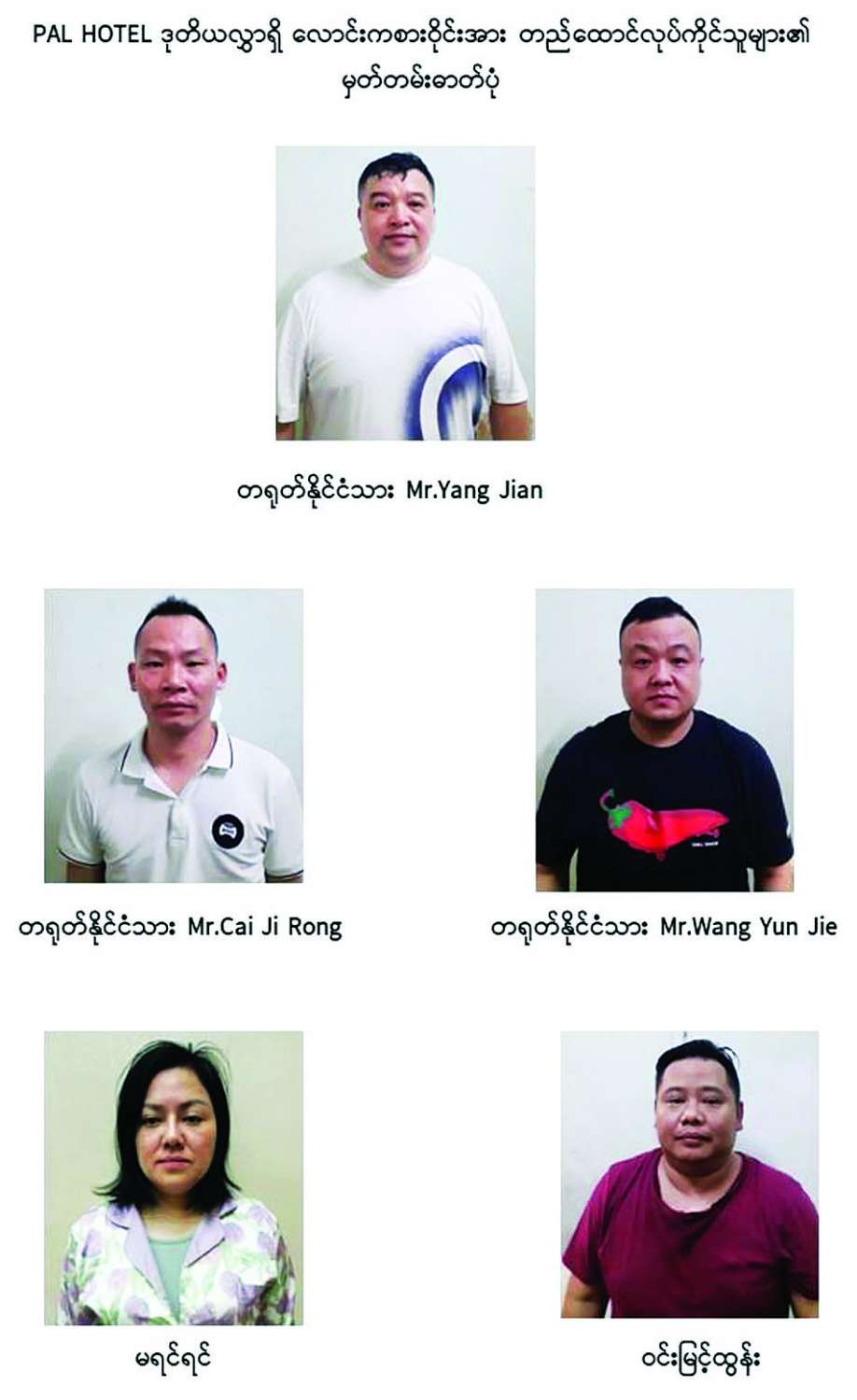 ထိုသို့ ရှာဖွေစစ်ဆေးခဲ့ရာ အဆိုပါဟိုတယ် ဒုတိယထပ်တွင် လောင်းကစားဝိုင်း တည်ထောင်၍ စီမံခန့်ခွဲလုပ်ကိုင်နေသူ Mr. Yang Jian ပါ တရုတ်နိုင်ငံသား အမျိုးသားသုံးဦး၊ မြန်မာနိုင်ငံသား အမျိုးသားတစ်ဦး၊ အမျိုးသမီးတစ်ဦး၊ လောင်းကစားဝိုင်း၌ အလုပ်လုပ်ကိုင်သူ မြန်မာနိုင်ငံသား အမျိုးသား ခုနစ်ဦး၊ အမျိုးသမီး ၂၄ ဦးနှင့် လောင်းကစားလာရောက် ကစားသူ တရုတ်နိုင်ငံသား အမျိုးသား ငါးဦး၊ အမျိုးသမီးတစ်ဦး၊ မြန်မာနိုင်ငံသား အမျိုးသား သုံးဦး၊ အမျိုးသမီးနှစ်ဦး စုစုပေါင်း ၄၇ ဦး တို့ကို လောင်းကစားပြုလုပ်ရာတွင် အသုံးပြုသည့် ဘူကြီးလောင်းကစားခုံ ငါးခုံ၊ ပဲကြားလော့လောင်းကစားခုံ နှစ်ခုံ၊ ကုလားသုံးကောင် လောင်းကစားခုံ တစ်ခုံ၊ ငါးပစ်ဂိမ်းလောင်းကစားခုံ တစ်ခုံ၊ ဖဲထုပ် ၂၅၄ ထုပ်၊ ငွေကျပ် ငါးရာမှ သိန်းတစ်ရာထိပါ တိုကင်ပြားများ၊ လက်ကိုင်ဖုန်း ၃၈ လုံး၊ လက်တော့နှစ်လုံး၊ Tablet တစ်လုံး၊ All in one ကွန်ပျူတာတစ်လုံး၊ လောင်းကစားပြုလုပ်ရာတွင် ငွေအလွှဲ/ အပြောင်းပြုလုပ်ရာ၌ အသုံးပြုသည့် Bank Account နံပါတ်များရေးသားထားသည့် ကတ်ပြားတစ်ခု၊ ဖဲချပ်ဖျက်စက်တစ်လုံး၊ ငွေရေတွက်စက်တစ်လုံး၊ CCTV Recorder တစ်လုံး၊ လောင်းကြေးငွေ ၃၀၁ သိန်းကျပ်၊ ကား ၁၇ စီးတို့နှင့်အတူ တွေ့ရှိဖမ်းဆီး ရမိခဲ့ပါသည်။