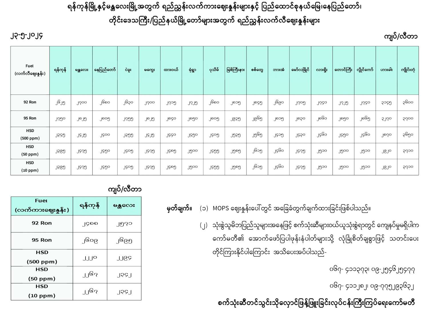 ရန်ကုန်မြို့နှင့် မန္တလေးမြို့အတွက် ရည်ညွှန်းလက်ကားဈေးနှုန်းများနှင့် ပြည်ထောင်စုနယ်မြေ နေပြည်တော်၊ တိုင်းဒေသကြီး/ပြည်နယ် မြို့တော်များအတွက် ရည်ညွှန်းလက်လီဈေးနှုန်းများ 05/23/2024