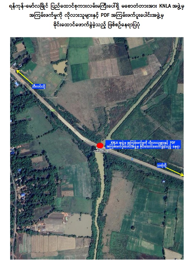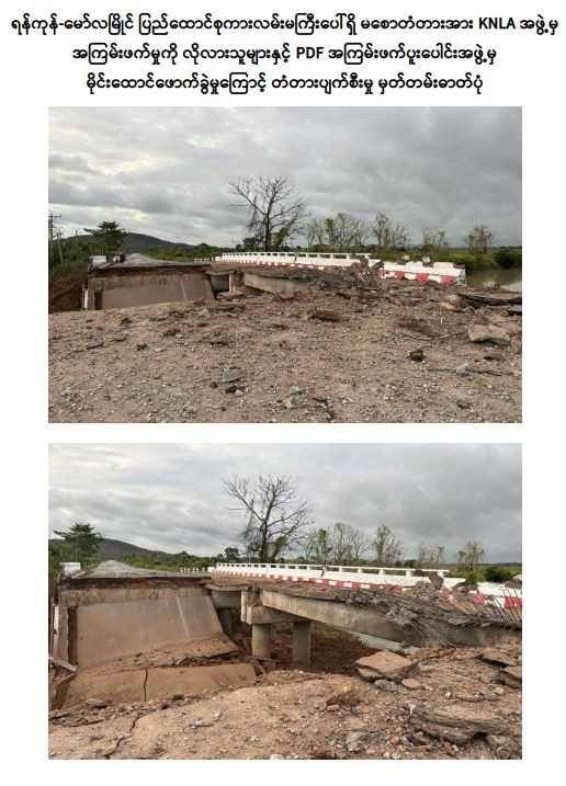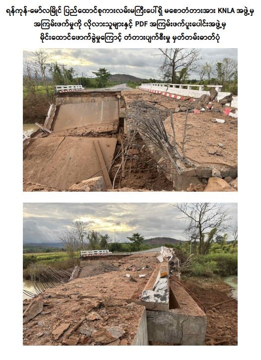 ယခုတွင်လည်း အများပြည်သူအားထား အသုံးပြုလျက်ရှိသည့် မွန်ပြည်နယ်၊ ဘီးလင်းမြို့နယ်၊ ရန်ကုန်-မော်လမြိုင်သွား ပြည်ထောင်စုလမ်းမပေါ်ရှိ မိုင်တိုင်အမှတ်၊ ၁၂၉/၁ နှင့် ၁၂၉/၂ ကြား၊ တံတားအမှတ်(၁/၁၃၀)၊ အရှည် ၁၀၆ ပေ၊ အကျယ် ၂၄ ပေ၊ ခံနိုင်ဝန်တန် ၆၀ ရှိ သံကူကွန်ကရစ် အမျိုးအစား မစောတံတားကို ယနေ့နံနက် ၅ နာရီ ခန့်တွင် KNLA အဖွဲ့မှ အကြမ်းဖက်မှု လိုလားသူများနှင့် PDF အမည်ခံ အကြမ်းဖက်ပူးပေါင်းအဖွဲ့များက မိုင်းထောင်ဖောက်ခွဲဖျက်ဆီးခဲ့သဖြင့် တံတားပြိုကျပျက်စီးမှု ဖြစ်ပွားခဲ့သည်။ ထိုသို့ တံတားကို မိုင်းထောင်ဖောက်ခွဲမှုကြောင့် တံတားပေါ်တွင် ဖြတ်သန်းမောင်းနှင်နေသည့် မော်တော်ဆိုင်ကယ် ၃ စီး တံတားအောက်သို့ ပြုတ်ကျခဲ့ပြီး ခရီးသွားပြည်သူ ၁ ဦး သေဆုံး၍ ၂ ဦးထိခိုက်ဒဏ်ရာရရှိခဲ့ကြောင်းနှင့် ဒဏ်ရာရရှိသူ ၂ ဦးအား ဘီးလင်းမြို့ ပြည်သူ့ဆေးရုံသို့ပို့ဆောင် ဆေးကုသမှုခဲ့ယူ စေလျက်ရှိကြောင်း သိရှိရသည်။