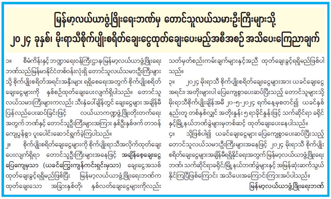 ၄။ သို့ဖြစ်ပါ၍ ယခင်ချေးငွေများ ပြေကျေစွာပေးဆပ်ပြီးသည့် တောင်သူလယ်သမားဦးကြီးများအနေဖြင့် ၂၀၂၄ မိုးရာသီ စိုက်ပျိုး စရိတ်ချေးငွေများအချိန်မီရရှိနိုင်ရေးအတွက် မြန်မာ့လယ်ယာဖွံ့ဖြိုးရေး ဘဏ်၊ သက်ဆိုင်ရာခရိုင်/မြို့နယ်ဘဏ်ခွဲများနှင့် အမြန်ဆုံးဆက်သွယ် နိုင်ကြပြီဖြစ်ကြောင်း အသိပေးအကြောင်းကြားအပ်ပါသည်။
