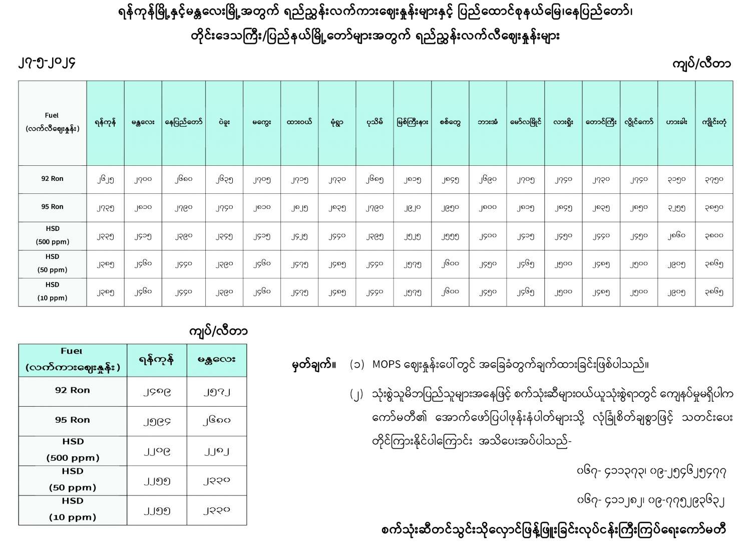 ရန်ကုန်မြို့နှင့် မန္တလေးမြို့အတွက် ရည်ညွှန်းလက်ကားဈေးနှုန်းများနှင့် ပြည်ထောင်စုနယ်မြေ နေပြည်တော်၊ တိုင်းဒေသကြီး/ ပြည်နယ် မြို့တော်များအတွက် ရည်ညွှန်းလက်လီဈေးနှုန်းများ 05/27/2024