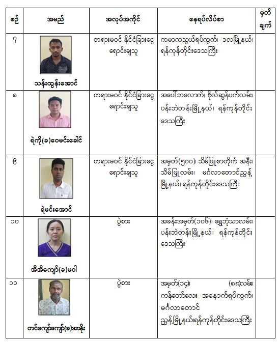 ၄။ ထိုကဲ့သို့ ပြည်တွင်းနိုင်ငံခြားငွေလဲလှယ်နှုန်းမတည်မငြိမ်ဖြစ်အောင် ဆောင်ရွက်လျက်ရှိသည့် ဖမ်းဆီးရမိတရားခံ စုစုပေါင်း ၁၄ ဦးအား ဥပဒေနှင့်အညီ ထိရောက်စွာ အရေးယူဆောင်ရွက်သွားမည်ဖြစ်ကြောင်း၊ ထွက်ပြေးတိမ်းရှောင်လျက်ရှိသည့် တရားခံ ၁၁ ဦးကိုလည်း ဖမ်းဆီးရမိရေး ဆောင်ရွက်လျက်ရှိပြီး မိဘပြည်သူများအနေဖြင့် အဆိုပါ ထွက်ပြေးတိမ်းရှောင်နေသည့် တရားခံများအား သိရှိပါက သက်ဆိုင်ရာလုံခြုံရေးအဖွဲ့အစည်းများထံ လျှို့ဝှက်စွာသတင်းပေးပို့နိုင်ကြောင်းနှင့် လက်ခံထားသူများကိုလည်း တရားဥပဒေအရ ထိရောက်စွာ အရေးယူဆောင်ရွက်သွားမည်ဖြစ်ပါကြောင်း အသိပေးသတင်းထုတ်ပြန်အပ်ပါသည်။