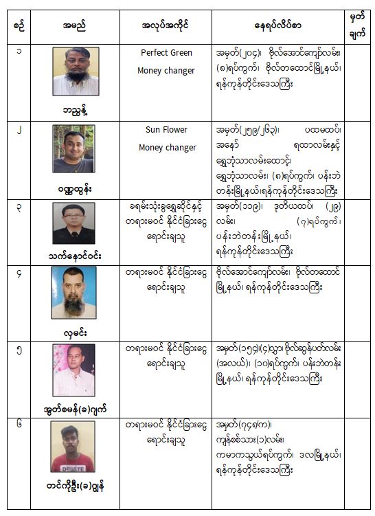 ၁။ နိုင်ငံတော်အစိုးရက နိုင်ငံတော်တည်ငြိမ်အေးချမ်းရေးနှင့် တရားဥပဒေစိုးမိုးရေးအတွက် အလေးထားဆောင်ရွက်လျက်ရှိရာ ဝိသမလောဘသားများအနေဖြင့် နိုင်ငံတော်၏ စီးပွားရေးဖွံ့ဖြိုးတိုးတက်မှုအား အနှောင့်အယှက်အဟန့်အတားဖြစ်စေရန် ရည်ရွယ်၍ ပြည်တွင်းနိုင်ငံခြားငွေလဲလှယ်နှုန်း မတည်မငြိမ်ဖြစ်စေရန် လူမှုကွန်ရက်မီဒီယာများမှတစ်ဆင့် ဝါဒဖြန့်ချိဈေးကစားခြင်း၊ ထို့အပြင် နိုင်ငံခြားငွေများ ဝယ်ယူရောင်းချလဲလှယ်ပေးခွင့်လိုင်စင်ရှိသည့် Money Changer အချို့သည်လည်း မြန်မာနိုင်ငံတော်ဗဟိုဘဏ်၏ စည်မျဉ်းသတ်မှတ်ချက်များအား ချိုးဖောက်၍ နိုင်ငံခြားငွေလဲလှယ်နှုန်းများအား ဈေးကစားပြီး နိုင်ငံ့စီးပွားရေး မငြိမ်မသက်ဖြစ်စေရန် ဆောင်ရွက်လျက်ရှိကြောင်း သတင်းရရှိသည့်အတွက် သက်ဆိုင်ရာလုံခြုံရေးအဖွဲ့အစည်းများမှ ဖော်ထုတ်ဖမ်းဆီးနိုင်ရေး ဆောင်ရွက်ခဲ့ပါသည်။