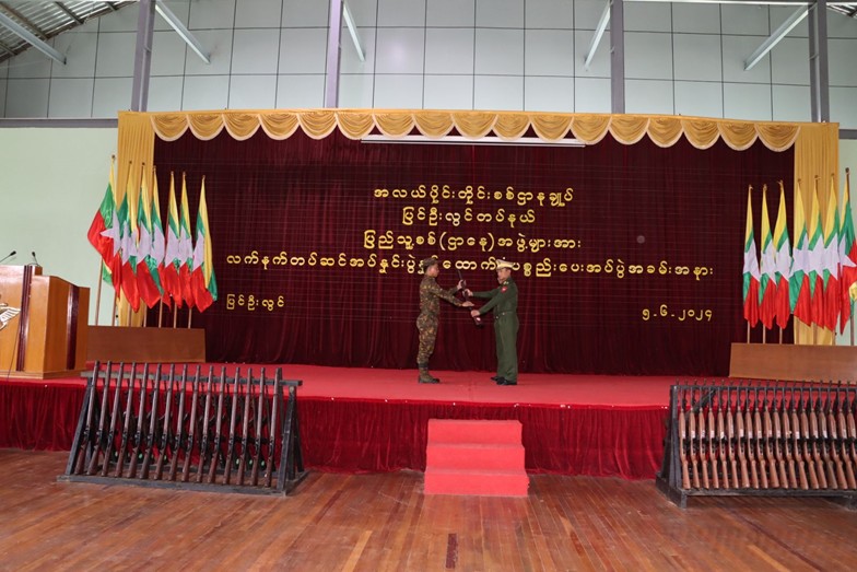 ဦးစွာ တပ်နယ်မှူးက အမှာစကားပြောကြားသည်။ ထို့နောက် တပ်နယ်မှူးနှင့် တာဝန်ရှိသူများက ပြည်သူ့စစ် (ဌာနေ) အဖွဲ့ဝင်များအတွက် လက်နက်များ တပ်ဆင်အပ်နှင်းပေးပြီး ထောက်ပံ့ပစ္စည်းများ ထောက်ပံ့ပေးအပ်ရာ ပြည်သူ့စစ် (ဌာနေ) အဖွဲ့ဝင်များကိုယ်စား အဖွဲ့ခေါင်းဆောင်တစ်ဦးက ကျေးဇူးတင်စကား ပြန်လည်ပြောကြားသည်။