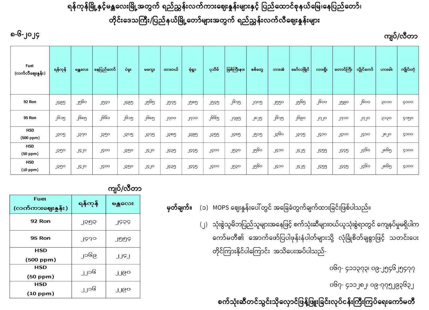 ရန်ကုန်မြို့နှင့် မန္တလေးမြို့အတွက် ရည်ညွှန်းလက်ကားဈေးနှုန်းများနှင့် ပြည်ထောင်စုနယ်မြေ နေပြည်တော်၊ တိုင်းဒေသကြီး/ ပြည်နယ် မြို့တော်များအတွက် ရည်ညွှန်းလက်လီဈေးနှုန်းများ 06/08/2024