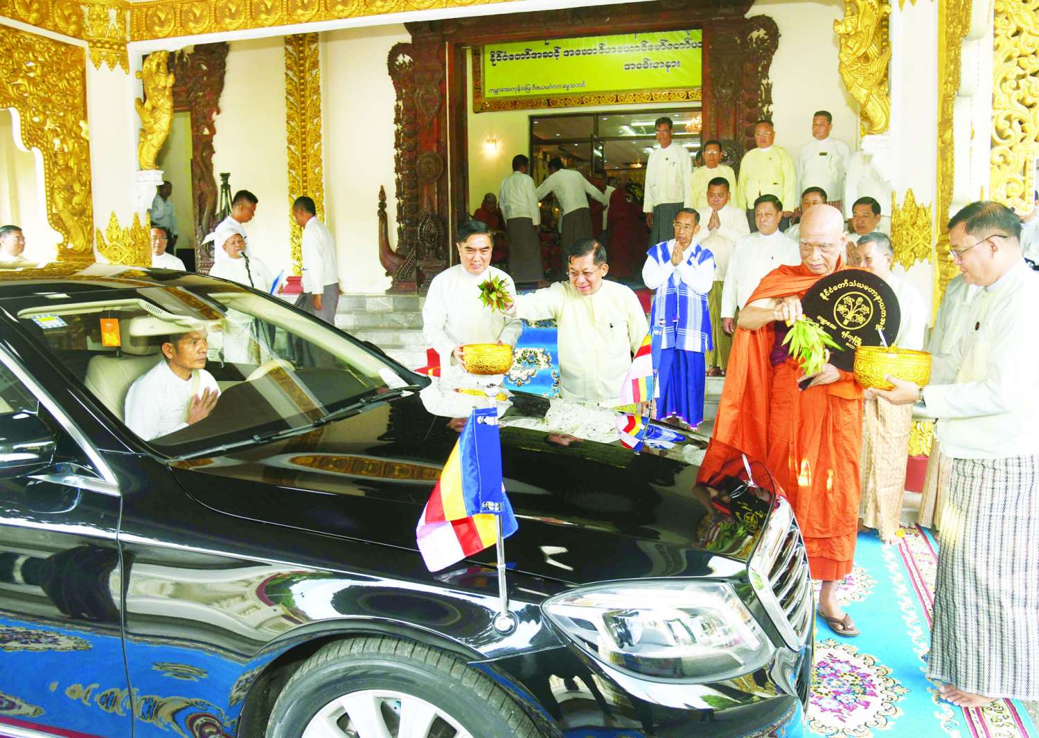 ယင်းနောက် နိုင်ငံတော်သံဃမဟာနာယကအဖွဲ့ဥက္ကဋ္ဌ သန်လျင်မင်းကျောင်း ဆရာတော်ကြီးအမှူးပြုသည့် ဆရာတော်ကြီးများနှင့် နိုင်ငံတော်စီမံအုပ်ချုပ်ရေးကောင်စီဥက္ကဋ္ဌ နိုင်ငံတော်ဝန်ကြီးချုပ်တို့က နိုင်ငံတော်သံဃမဟာနာယက ဆရာတော်ကြီးများထံ ဆက်ကပ်အပ်နှံထားရှိသည့် နိုင်ငံတော်အဆင့် အဆောင်အယောင်မော်တော်ယာဉ်များအား တစ်စီးချင်းစီအလိုက် ပရိတ်နံ့သာရည်များ ပက်ဖျန်း၍ သဒ္ဓိမင်္ဂလာဆင်ယင်ကြသည်။