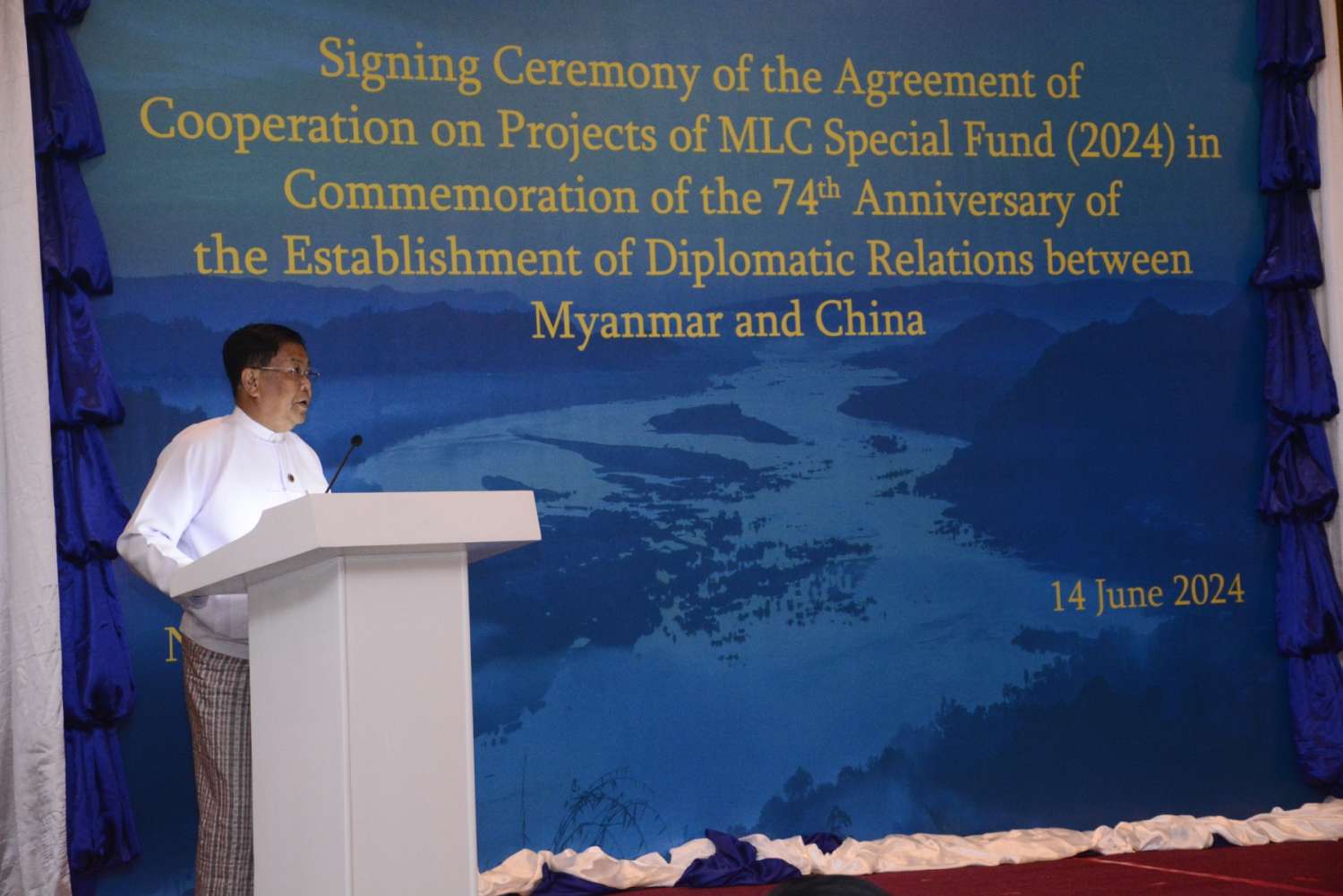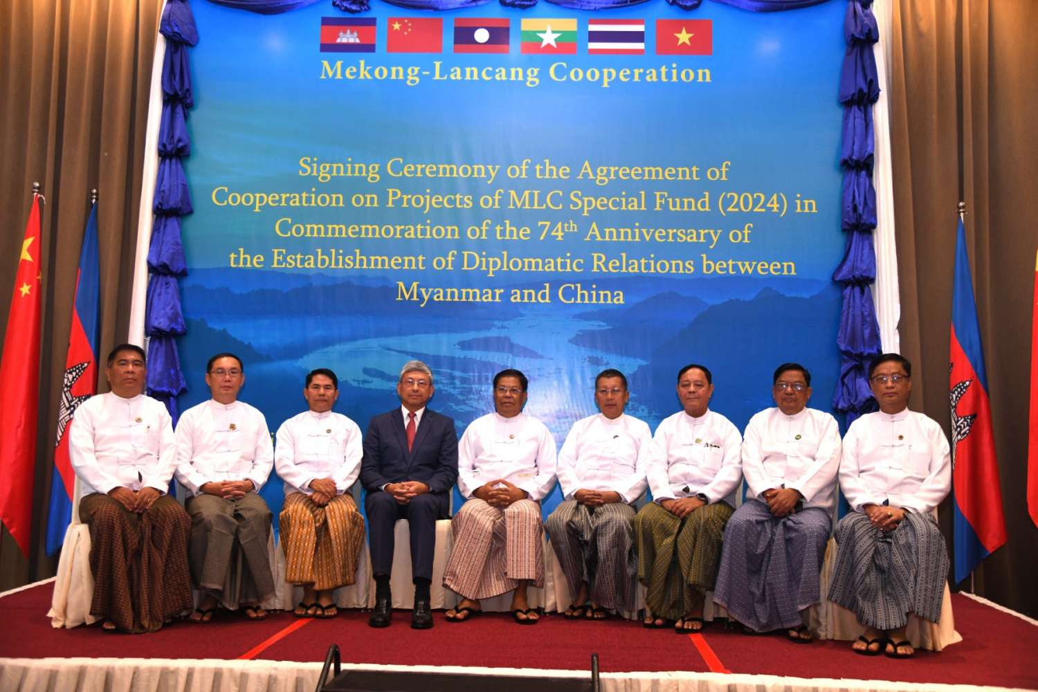 ပြည်ထောင်စုသမ္မတမြန်မာနိုင်ငံနှင့် တရုတ်ပြည်သူ့သမ္မတနိုင်ငံတို့အကြား သံတမန် ဆက်ဆံရေးထူထောင်မှု (၇၄) နှစ်မြောက် နှစ်ပတ်လည်နေ့အထိမ်းအမှတ်အဖြစ် မြန်မာ-တရုတ် နှစ်နိုင်ငံအကြား မဲခေါင်-လန်ချန်း ပူးပေါင်းဆောင်ရွက်မှုအထူးရန်ပုံငွေ (၂၀၂၄) ဖြင့် အကောင်အထည်ဖော်ဆောင်ရွက်မည့် စီမံကိန်းများအတွက် ရန်ပုံငွေလွှဲပြောင်းမှုဆိုင်ရာ သဘောတူညီချက် လက်မှတ်ရေးထိုးသည့် အခမ်းအနားတစ်ရပ်ကို ၁၄-၆-၂၀၂၄ ရက်နေ့၊ နံနက်ပိုင်းတွင် နေပြည်တော်ရှိ M Gallery ဟိုတယ်၌ ကျင်းပပြုလုပ်ခဲ့သည်။