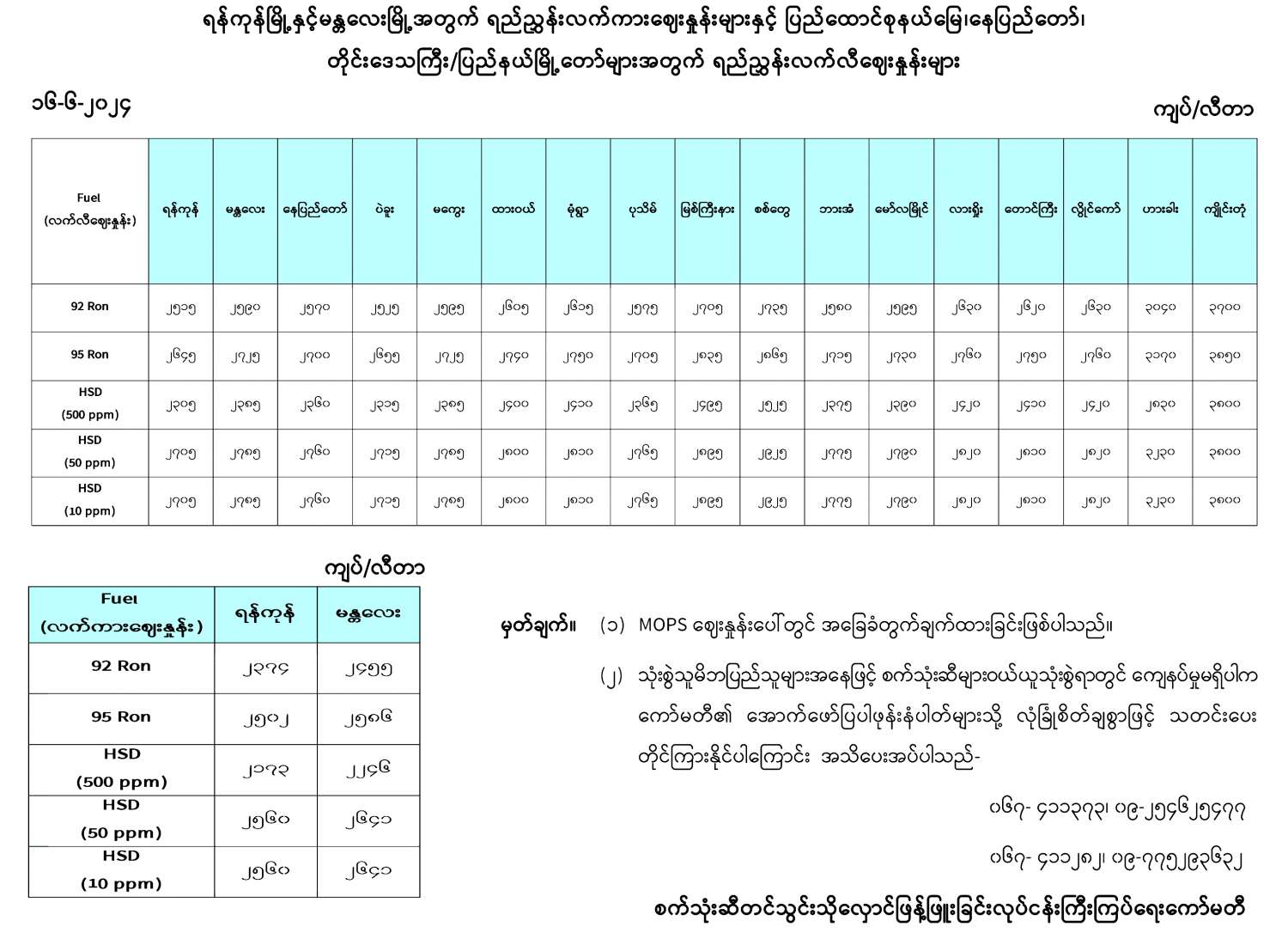 ရန်ကုန်မြို့နှင့် မန္တလေးမြို့အတွက် ရည်ညွှန်းလက်ကားဈေးနှုန်းများနှင့် ပြည်ထောင်စုနယ်မြေ နေပြည်တော်၊ တိုင်းဒေသကြီး/ပြည်နယ် မြို့တော်များအတွက် ရည်ညွှန်းလက်လီဈေးနှုန်းများ 06/16/2024