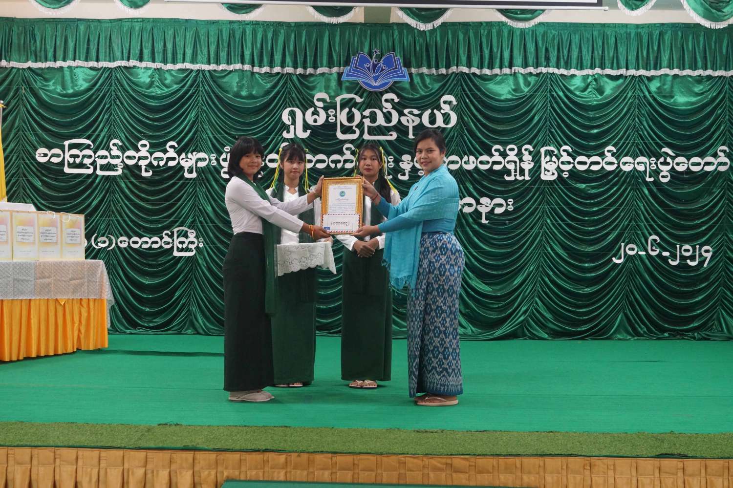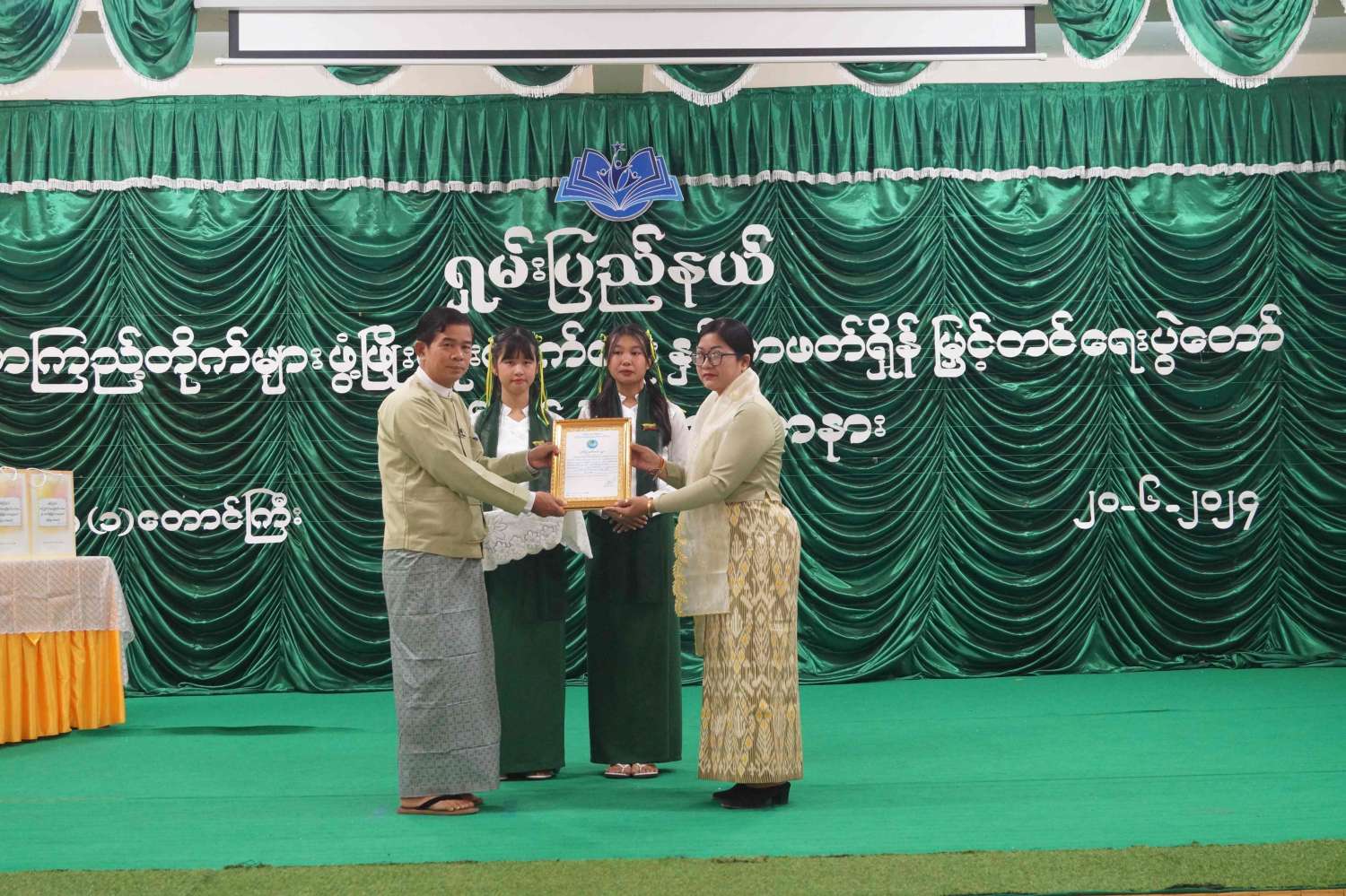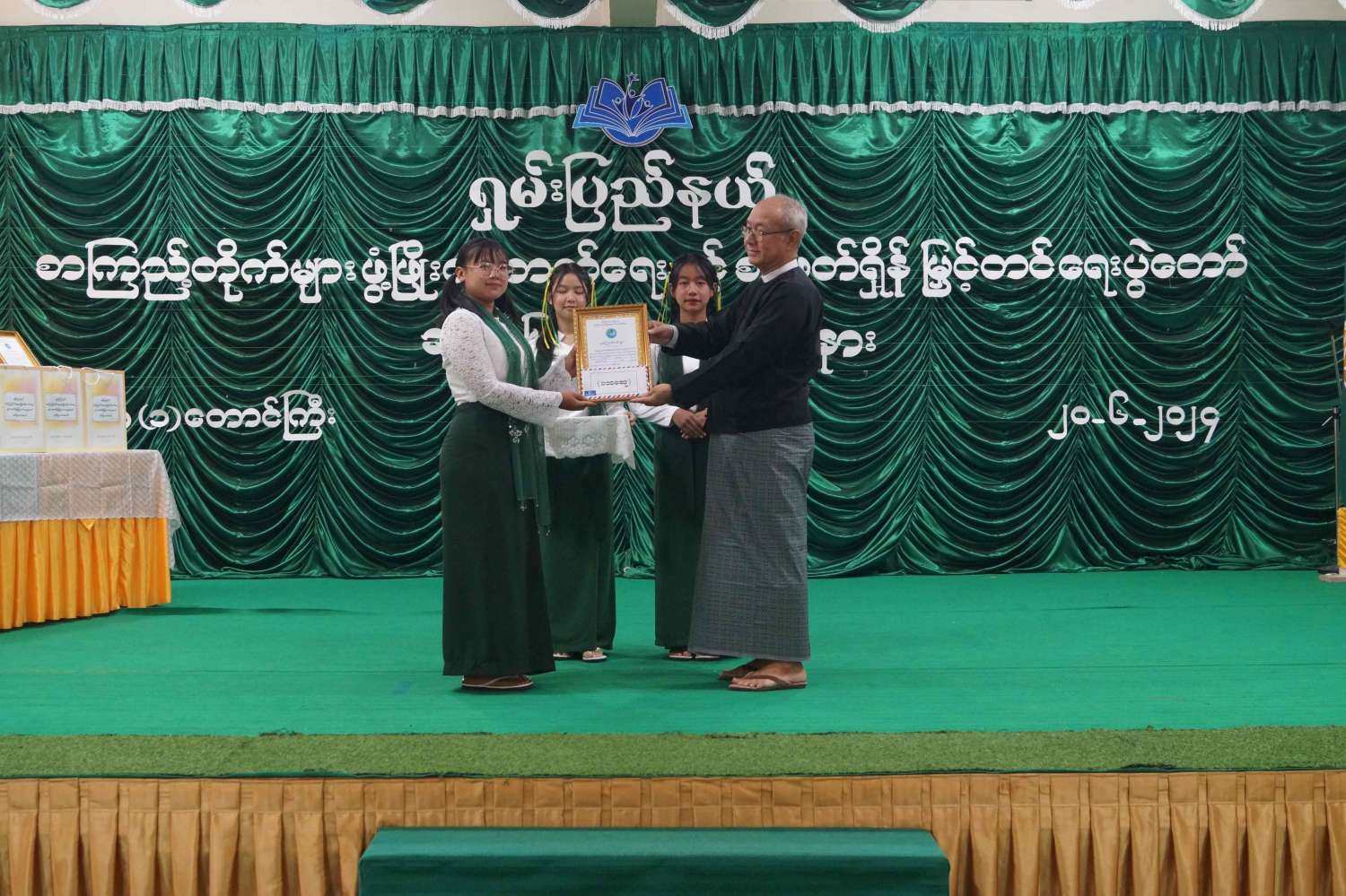 ရှမ်းပြည်နယ်အတွင်းရှိ ကျောင်းစာကြည့်တိုက်များ ဖွံ့ဖြိုးတိုးတက်ရေးနှင့် ကျောင်းသားလူငယ်များ စာဖတ်သည့် အလေ့အထတွင် ပျော်မွေ့လာစေရန် ရည်ရွယ်၍ ပထမအကြိမ် ရှမ်းပြည်နယ် စာကြည့်တိုက်များ ဖွံ့ဖြိုးတိုးတက်ရေးနှင့် စာဖတ်ရှိန်မြှင့်တင်ရေးပွဲတော် ပြိုင်ပွဲများတွင် ဆုရရှိသော ကျောင်းသား၊ ကျောင်းသူများအား ဆုချီးမြှင့်ပွဲအခမ်းအနားကို ယနေ့ နံနက်(၉)နာရီက တောင်ကြီးမြို့ အမှတ် (၁) အခြေခံပညာ အထက်တန်းကျောင်း၊ ဒေါ်ခင်သိန်းခန်းမ၌ ကျင်းပ ပြုလုပ်ခဲ့သည်။