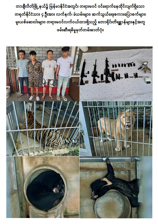 ဖြစ်စဉ်မှာ ၂၀၂၄ ခုနှစ်၊ ဇွန်လ ၁၉ ရက်နေ့ မွန်းလွဲ ၃ နာရီ ၂၀ မိနစ်တွင် တာချီလိတ်မြို့နယ်၊ ဝမ်ကျောက်လုံကျေးရွာရှိ ဒေါ်အီလာခမ်း(ဘ)ဦးအိုက်ဟုန် ပိုင်ဆိုင်သည့် ခြံအမှတ်(ဝကလ-၀၆၄)ရှိ ငါးကန်ဟောင်းနေရာ၌ တရုတ်နိုင်ငံသားများ တရားမဝင်ရောက်ရှိနေထိုင်လျက်ရှိကြောင်း သတင်းအရ လုံခြုံရေးတပ်ဖွဲ့ဝင်များပါဝင်သောပူးပေါင်းအဖွဲ့က ဝင်ရောက်စစ်ဆေးရာ အဆိုပါနေရာ၌ တရားမဝင်ရောက်ရှိနေထိုင်လျက်ရှိသည့် တရုတ်နိုင်ငံသား အန်းဟွေးပြည်နယ်၊ ရှန်ရင်တုန့်ပိုင် မြို့နေ ရှောက်ဟူ(၃၄)နှစ် (ဘ)ဝမ်းလိ၊ ဖူးကျန့်ပြည်နယ်၊ လုံးရမ်မြို့နေ လောင်ရောင်း(၄၅)နှစ် (ဘ)လောင်ဖိန်း၊ ဟူနန်ပြည်နယ်၊ ဟိန်းရမ်မြို့နေ လောက်လျိုး(၃၄)နှစ် (ဘ)လျှိုးရှင်းယုံနှင့် ကွေ့ကျုံးပြည်နယ်၊ အန်းစွင့်မြို့နေ အားဖိန်း(၂၈)နှစ် (ဘ)အားကျင်းတို့ ၄ ဦးအား MK 12 အမျိုးအစား သေနတ် ၁ လက်၊ ၎င်းကျည်အိမ် ၁ ခု၊ ကျည် ၁၀ တောင့်၊ M 16 အမျိုးအစားသေနတ် ၁ လက်၊ ၎င်းကျည်အိမ် ၁ ခု၊ ကျည် ၁၉ တောင့်၊ CZ 512 အမျိုးအစားသေနတ် ၁ လက်၊ ၎င်းကျည်အိမ် ၁ ခု၊ ပွိုင့် ၂၂ ကျည် ၉၁ တောင့်၊ GLOCK-19 ပစ္စတိုသေနတ် ၁ လက်၊ ၎င်းကျည်အိမ် ၁ ခု၊ ကျည် ၈ တောင့်၊ Sig Sauer ပစ္စတိုသေနတ် ၂ လက်၊ ၎င်းကျည်အိမ် ၂ ခု၊ ကျည် ၂၁ တောင့်၊ ဆက်သွယ်ရေး စကားပြောစက် ၈ လုံး၊ ကတ်တမင်း ၁၅၀ ဂရမ်ခန့်၊ မူးယစ်ဆေးဝါးမွှေစက် ၁ လုံးနှင့် တရားမဝင်လက်ဝယ်ထားရှိသည့် တောရိုင်းတိရစ္ဆာန် ခြင်္သေ့ ၁ ကောင်၊ ကျား ၁ ကောင်၊ ဝက်ဝံ ၂ ကောင်တို့နှင့် အတူတွေ့ရှိဖမ်းဆီးရမိခဲ့သည်။