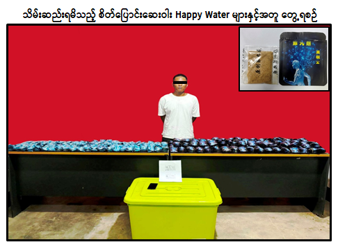 မူးယစ်ဆေးဝါးတားဆီးနှိမ်နင်းရေးရဲတပ်ဖွဲ့မှ တပ်ဖွဲ့ဝင်များပါဝင်သော ပူးပေါင်းအဖွဲ့သည် ဇွန်လ ၁၈ ရက်နေ့ ည ၁၀ နာရီအချိန် ရှမ်းပြည်နယ်(အရှေ့ပိုင်း)၊ ကျိုင်းတုံမြို့နယ်၊ ဝမ်တာပုံကျေးရွာအနီးတွင် TOYOTA WISH ခရီးသည် တင်မော်တော်ယာဉ်ကို သတင်းအရရှာဖွေရာ ယာဉ်ပေါ်ပါခရီးသည် အိုက်ဆန်း(ခ)အိုက်ပေါင်း သယ်ဆောင်လာသည့် ပလတ်စတစ်ပုံးအတွင်းမှ ဒေသကာလတန်ဖိုးငွေကျပ် ၁ ဘီလီယံကျော်တန်ဖိုးရှိ စိတ်ပြောင်းဆေးဝါး Happy Water ၉ ဒသမ ၆ ကီလို သိမ်းဆည်းရမိခဲ့ပြီး စစ်ဆေးဖော်ထုတ်ချက်အရ သိမ်းဆည်းရမိ စိတ်ပြောင်းဆေးဝါးများအား မိုင်းယန်းမြို့နယ်၊ မိုင်းပေါက်မြို့မှ တာချီလိတ်မြို့သို့ သယ်ဆောင်ရောင်းဝယ်ခြင်းဖြစ်ကြောင်းနှင့် သိမ်းဆည်းရမိ စိတ်ပြောင်းဆေးဝါးများသယ်ဆောင်ရာ၌ ပူးပေါင်းပါဝင်သူ ခင်ခင်ဦး(ခ)စီစီနှင့် အိုက်ဆန်း(ခ)အိုက်ပေါင်းတို့အား ဥပဒေအရ အရေးယူထားရှိပြီး ကွင်းဆက်ပြစ်မှုကျူးလွန်သူများအား ဆက်လက်စစ်ဆေးဖော်ထုတ်လျက်ရှိကြောင်း မြန်မာနိုင်ငံရဲတပ်ဖွဲ့မှ သတင်းရရှိသည်။