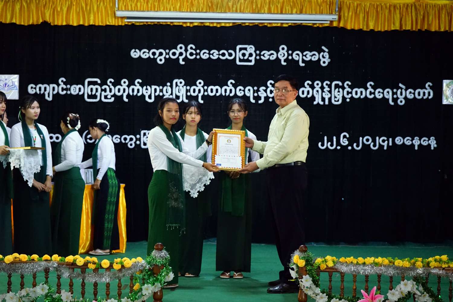 ထို့နောက် တိုင်းဒေသကြီးဝန်ကြီးချုပ်က စာရေးဆရာတင်လင်းဇော်အား အမှတ်တရလက်ဆောင်ပေးအပ်ပြီး ကျောင်းစာကြည့်တိုက်အတွက် လူထုသိပ္ပံအတွဲ (၁၊ ၂၊ ၃) သုတ၊ ရသ စာအုပ်စာစောင်များ လှူဒါန်း၍ သီဆိုဖျော်ဖြေခဲ့သည့် ကျောင်းသား၊ကျောင်းသူများအတွက် ဂုဏ်ပြုချီးမြှင့်ငွေများအား အသီးသီးပေးအပ်ခဲ့ကာ တိုင်းဒေသကြီးဝန်ကြီးချုပ်နှင့် တာဝန်ရှိသူများက ခန်းမအတွင်း ခင်ကျင်းပြသထားသည့် စာအုပ်စာစောင်များအား လှည့်လည်ကြည့်ရှုခဲ့သည်။
