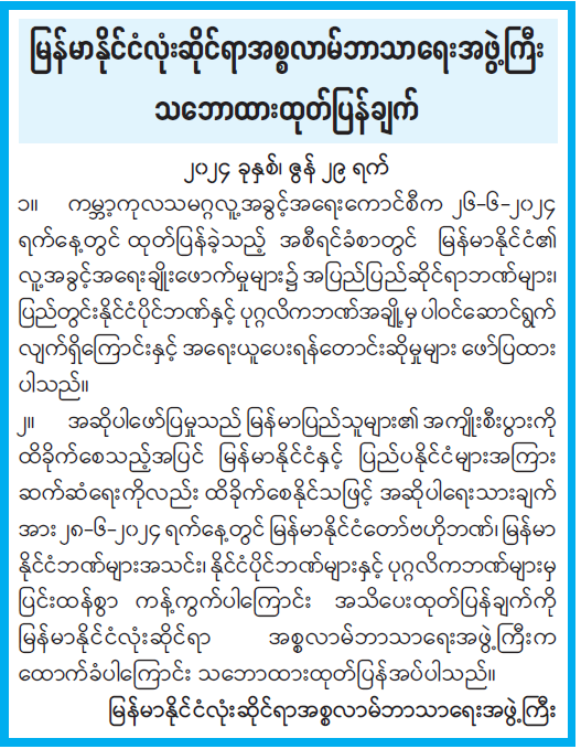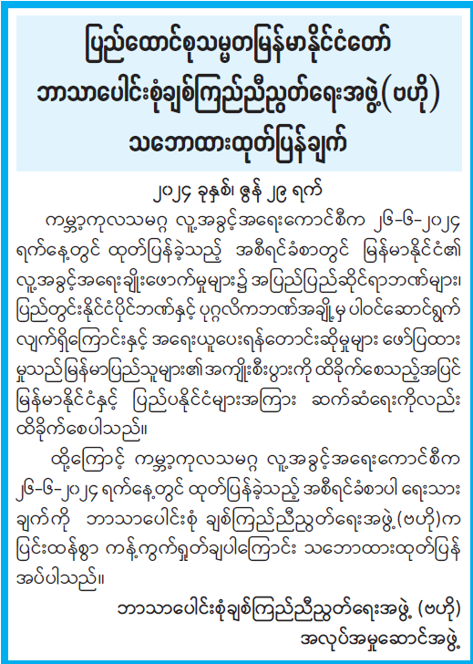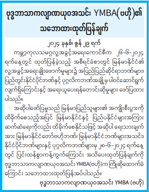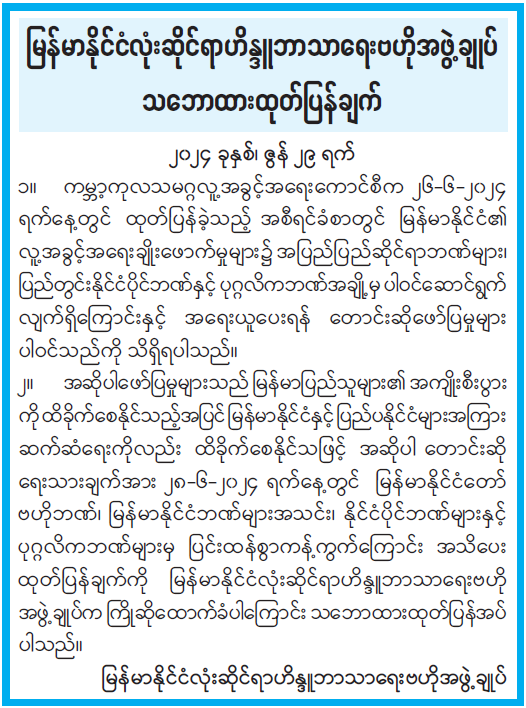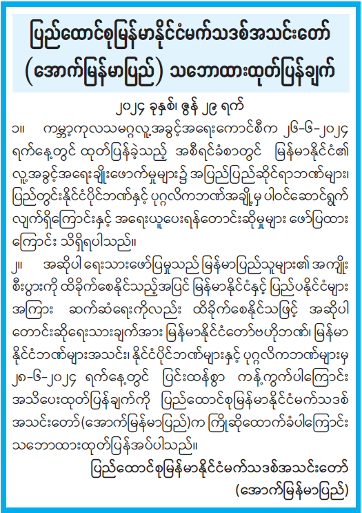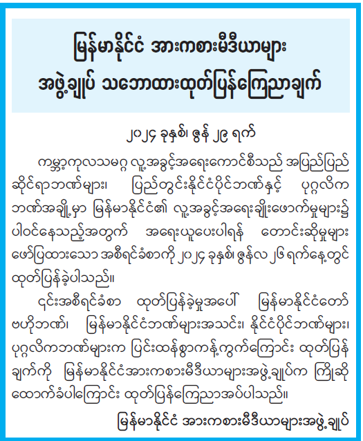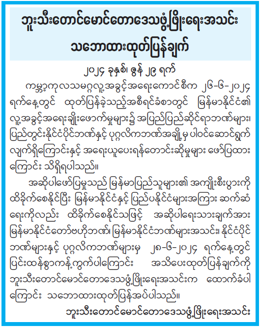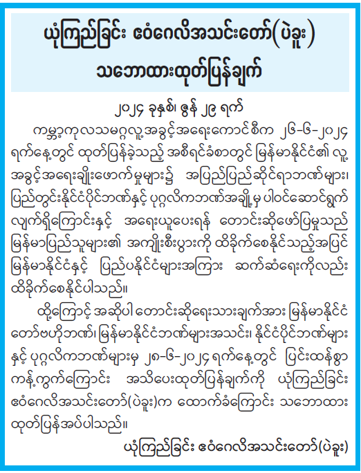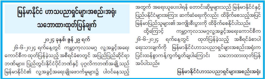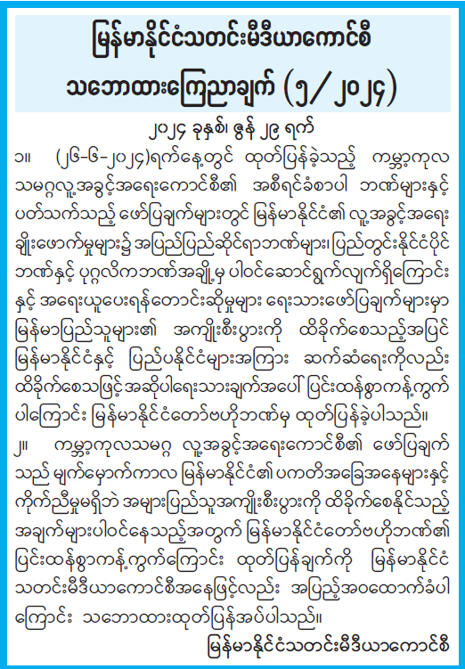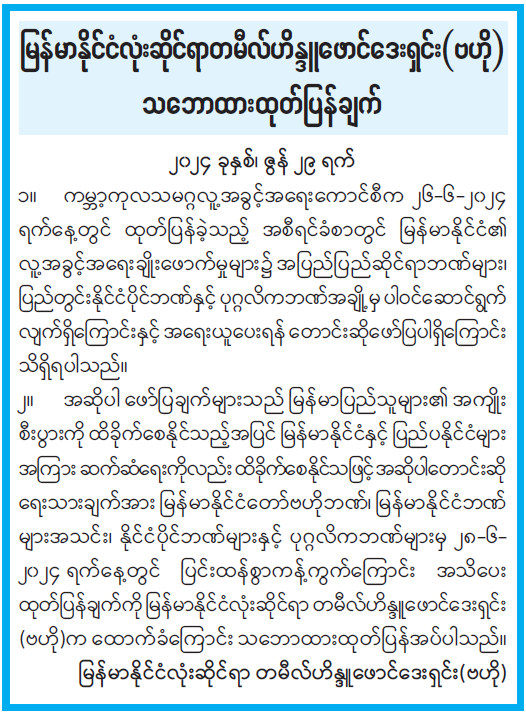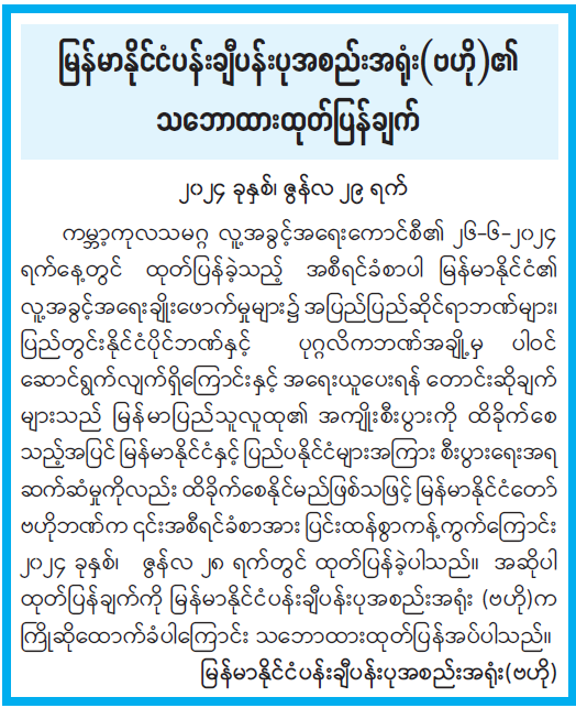 အဆိုပါ ကမ္ဘာ့ကုလသမဂ္ဂလူ့အခွင့်အရေးကောင်စီ၏ အစီရင်ခံစာပါ ရေးသားချက်များအပေါ် ပြင်းထန်စွာ ကန့်ကွက်ကြောင်း မြန်မာနိုင်ငံတော်ဗဟိုဘဏ်၊ မြန်မာနိုင်ငံဘဏ်များအသင်း၊ နိုင်ငံပိုင်ဘဏ်များ၊ ပုဂ္ဂလိကဘဏ်များ၏ သဘောထားထုတ်ပြန်ချက်ကို မြန်မာနိုင်ငံသတင်းမီဒီယာကောင်စီ၊ ဗုဒ္ဓဘာသာကလျာဏယုဝအသင်းYMBA (ဗဟို)၊ ဘာသာပေါင်းစုံ ချစ်ကြည်ညီညွတ်ရေးအဖွဲ့ (ဗဟို)၊ သနန္တနဓမ္မပါလက (ဟိန္ဒူ) အဖွဲ့ချုပ်၊ ပြည်ထောင်စုမြန်မာနိုင်ငံမက်သဒစ်အသင်းတော် (အောက်မြန်မာပြည်)၊ မြန်မာနိုင်ငံလုံးဆိုင်ရာ အစ္စလာမ်ဘာသာရေးအဖွဲ့ကြီး၊ ပိန္နဲကုန်းရခိုင်ဂျာမေဗလီ၊ ဘူးသီးတောင် မောင်တောဒေသဖွံ့ဖြိုးရေးအသင်း၊ မြန်မာနိုင်ငံ ဧဝံဂေလိခရစ်ယာန်မဟာမိတ်အဖွဲ့ချုပ်၊ လွတ်မြောက်ခြင်းအသင်းတော် (ရန်ကုန်)၊ မြန်မာနိုင်ငံလုံးဆိုင်ရာ ဟိန္ဒူဘာသာရေးဗဟိုအဖွဲ့ချုပ်၊ ယုံကြည်ခြင်းဧဝံဂေလိအသင်းတော် (ပဲခူး)၊ မြန်မာနိုင်ငံလုံးဆိုင်ရာ တမီလ်ဟိန္ဒူဖောင်ဒေးရှင်း(ဗဟို)၊ မြန်မာနိုင်ငံဂီတအစည်းအရုံး (ဗဟို)၊ မြန်မာနိုင်ငံသဘင်အစည်းအရုံး (ဗဟို)၊ မြန်မာနိုင်ငံရုပ်ရှင်အစည်းအရုံး၊ မြန်မာနိုင်ငံဟာသပညာရှင်များအစည်းအရုံး၊ မြန်မာနိုင်ငံစာရေးဆရာအသင်း၊ မြန်မာနိုင်ငံပန်းချီပန်းပုအစည်းအရုံး (ဗဟို) နှင့် မြန်မာနိုင်ငံအားကစားမီဒီယာများအဖွဲ့ချုပ်တို့မှ ထောက်ခံကြိုဆိုပါကြောင်း သဘောထားများ အသီးသီးထုတ်ပြန်ခဲ့ကြကြောင်း သတင်းရရှိသည်။