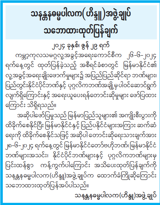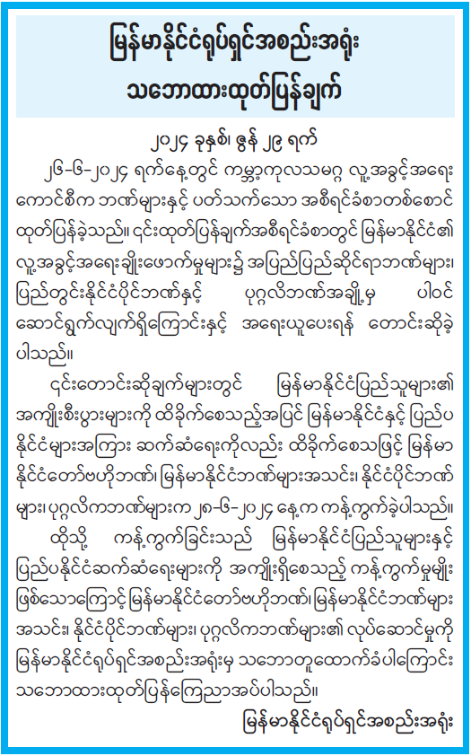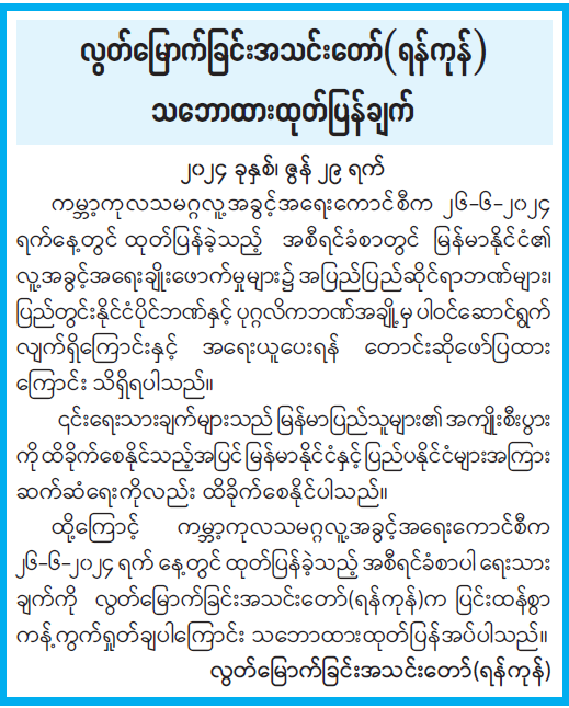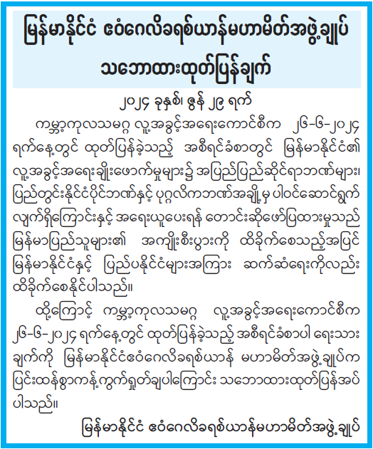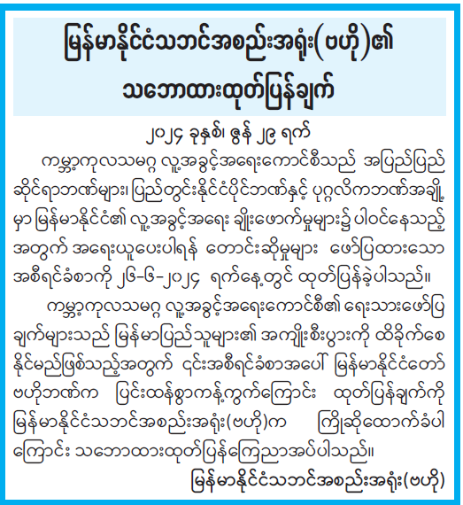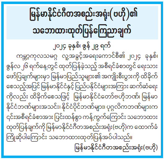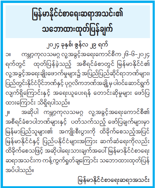 ထိုကဲ့သို့ ကမ္ဘာ့ကုလသမဂ္ဂလူ့အခွင့်အရေးကောင်စီ၏ အစီရင်ခံစာတွင် ရေးသားဖော်ပြချက်များမှာ မြန်မာပြည်သူများ၏ အကျိုးစီးပွားကို ထိခိုက်စေသည့်အပြင် မြန်မာနိုင်ငံနှင့် ပြည်ပနိုင်ငံများအကြား ဆက်ဆံရေးကိုလည်း ထိခိုက်စေသဖြင့် မြန်မာနိုင်ငံတော်ဗဟိုဘဏ်၊ မြန်မာနိုင်ငံဘဏ်များအသင်း၊ နိုင်ငံပိုင်ဘဏ်များ၊ ပုဂ္ဂလိကဘဏ်များက ၎င်းအစီရင်ခံစာတွင်ပါဝင်သည့် ရေးသားချက်များအား ပြင်းထန်စွာ ကန့်ကွက်ကြောင်း ၂၈-၆-၂၀၂၄ ရက်နေ့တွင် ထုတ်ပြန်ကြေညာခဲ့သည်။