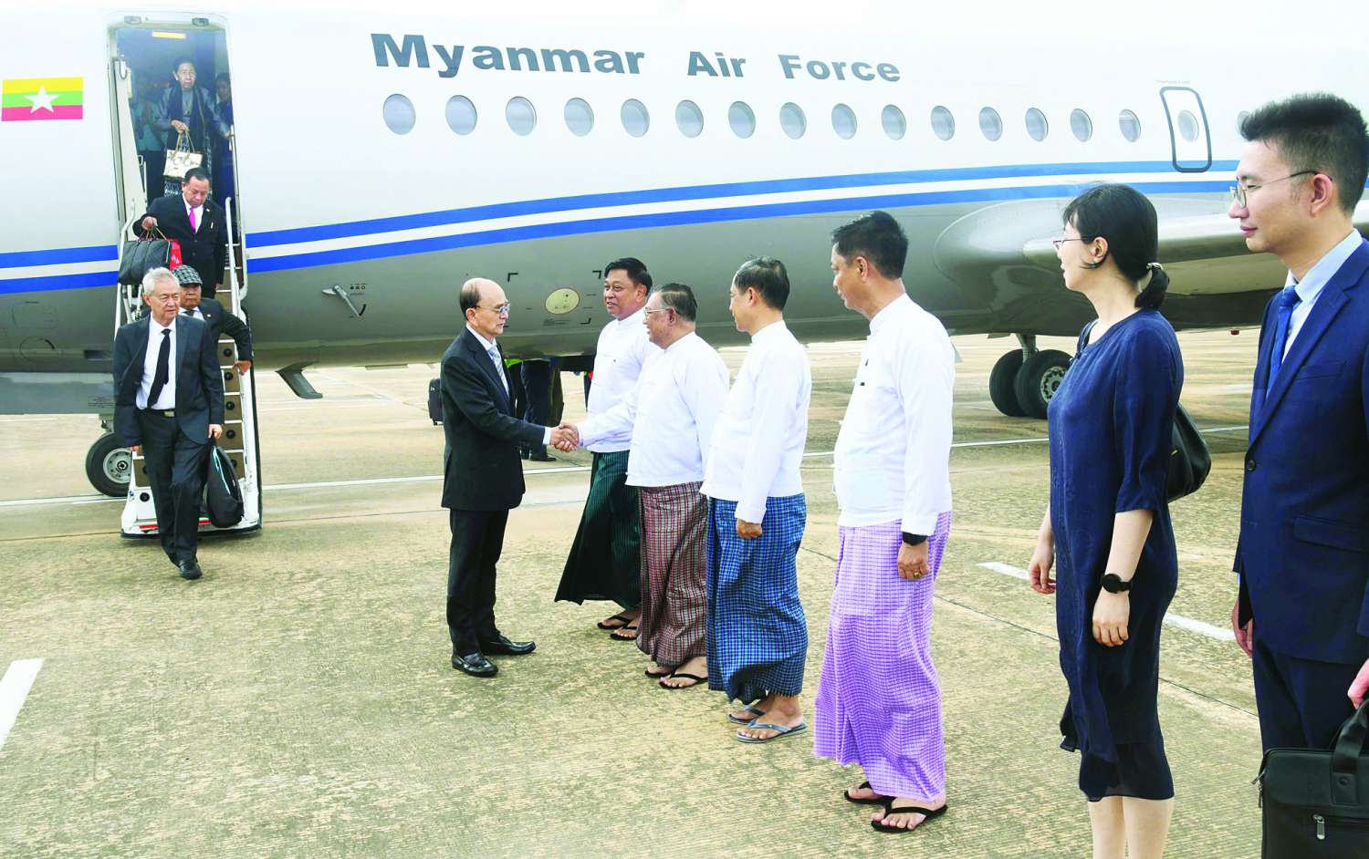 နိုင်ငံတော်သမ္မတ(ငြိမ်း) ခေါင်းဆောင်သည့် မြန်မာကိုယ်စားလှယ်အဖွဲ့သည် တရုတ်ပြည်သူ့သမ္မတနိုင်ငံ၌ ကျင်းပသည့် ငြိမ်းချမ်းစွာအတူယှဉ်တွဲမူကြီး (၅) ရပ် ချမှတ်ခဲ့သည့် နှစ် (၇၀) ပြည့် အထိမ်းအမှတ်အခမ်းအနားသို့ တက်ရောက်ခဲ့ပြီးနောက် ၃၀-၆-၂၀၂၄ ရက် (၁၄၂၅) နာရီတွင် အထူးလေယာဉ်ဖြင့် တရုတ်ပြည်သူ့သမ္မတနိုင်ငံ၊ ပေကျင်းမြို့မှနေပြည်တော်သို့ ပြန်လည်ရောက်ရှိခဲ့ရာ နိုင်ငံတော်စီမံအုပ်ချုပ်ရေးကောင်စီအဖွဲ့ဝင်၊ ဒုတိယဝန်ကြီးချုပ်နှင့် ကာကွယ်ရေးဝန်ကြီးဌာန၊ ပြည်ထောင်စုဝန်ကြီးဗိုလ်ချုပ်ကြီးတင်အောင်စန်း၊ နိုင်ငံတော်စီမံအုပ်ချုပ်ရေးကောင်စီအဖွဲ့ဝင် ဦးဝဏ္ဏမောင်လွင်၊ နိုင်ငံတော်စီမံအုပ်ချုပ်ရေးကောင်စီဥက္ကဋ္ဌရုံးဝန်ကြီးဌာန (၂)၊ ပြည်ထောင်စုဝန်ကြီး ဦးကိုကိုလှိုင်၊ နိုင်ငံခြားရေးဝန်ကြီးဌာန၊ ဒုတိယဝန်ကြီးဦးလွင်ဦး၊ ရန်ကုန်မြို့၊ တရုတ်သံရုံးမှ သံရုံးဒုတိယအကြီးအကဲ (သံမှူးကြီး) မစ္စစ်ချောင်ဂျင်နှင့် နိုင်ငံခြားရေးဝန်ကြီးဌာနမှ အဆင့်မြင့်အရာရှိကြီးများက နေပြည်တော်လေဆိပ်တွင် ကြိုဆိုနှုတ်ဆက်ခဲ့ကြသည်။