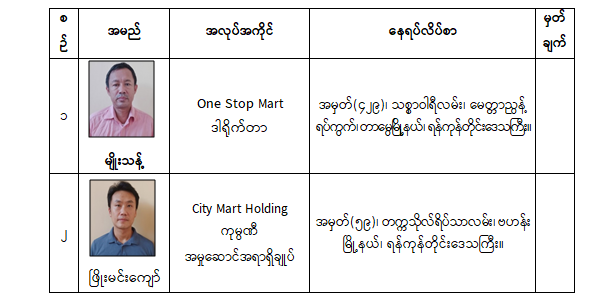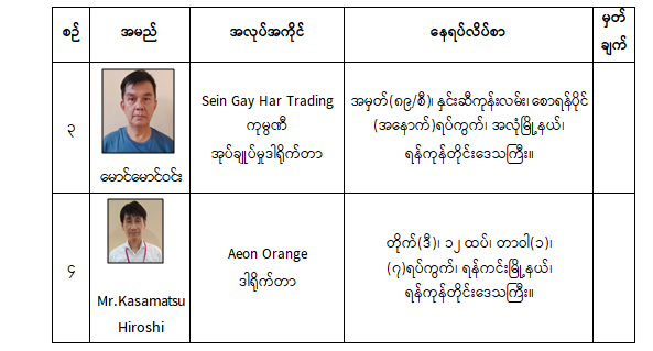 သို့ဖြစ်၍ သတ်မှတ်ဈေးနှုန်းထက် ၁၁ ရာခိုင်နှုန်းမှ ၃၀ ရာခိုင်နှုန်းအထိ ပိုမိုအမြတ်တင်ရောင်းချခဲ့သည့် ဆန်စပါးလုပ်ငန်းရှင် ၂၄ ဦးကို ၎င်းတို့ရရှိခဲ့သည့် အကျိုးအမြတ်များအပေါ် ဒဏ်ကြေးနှင့်အခွန် ထပ်မံစည်းကြပ်သွားမည်ဖြစ်ကြောင်း၊ သတ်မှတ်ဈေးနှုန်းထက် ၃၁ ရာခိုင်နှုန်းမှ ၇၀ ရာခိုင်နှုန်းအထိ ပိုမို၍အကျိုးအမြတ်များစွာ ရယူရောင်းချခဲ့သည့် အောက်ပါဆန်စပါး လုပ်ငန်းရှင် ၇ ဦးကို ၂၀၁၂ ခုနှစ်၊ အရေးကြီး ကုန်စည်နှင့် ဝန်ဆောင်မှုဥပဒေပုဒ်မ-၅ အရ အရေးယူ ဆောင်ရွက်သွားမည်ဖြစ်ပါသည်-