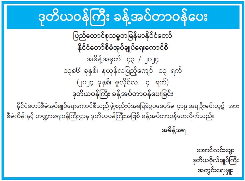 ဒုတိယဝန်ကြီး ခန့်အပ်တာဝန်ပေးခြင်း