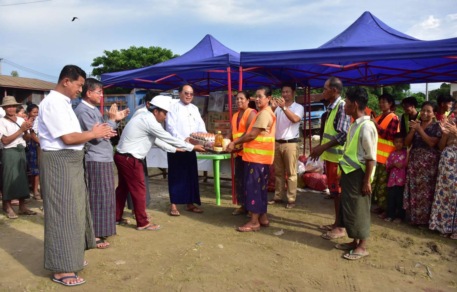 ယင်းနောက်ပြည်နယ်ဝန်ကြီးက ရေဘေးသင့် စည်ပင်လုပ်သားဝန်ထမ်းများမှ အိမ်ထောင်စု(၆၇)စု လူဦးရေ(၂၆၀)ဦးအတွက် ငွေကျပ်တန်ဖိုး (၅၄)သိန်း တန်ဖိုးရှိ ဆန်၊ ဆီ၊ ကုလားပဲ၊ ကြက်ဥ၊ ကြက်သွန်၊ အာလူးနှင့် ခေါက်ဆွဲဖာများစသည့် အခြေခံစားသောက်ကုန်များအား ထောက်ပံ့ပေးအပ်ကာ ရင်းရင်းနှီးနှီး နှစ်သိမ့်အားပေးစကားပြောကြားခဲ့ကြောင်း သိရသည်။
