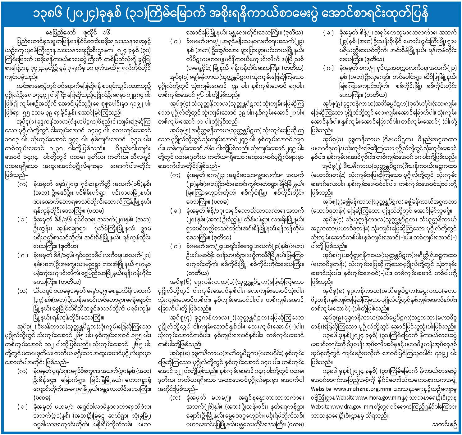 ၁၃၈၆ (၂၀၂၄) ခုနှစ်၊ (၃၁) ကြိမ်မြောက် အစိုးရနိကာယ်စာမေးပွဲ အောင်စာရင်းထုတ်ပြန်