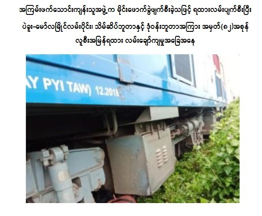 နိုင်ငံတော်အစိုးရအနေဖြင့် အများပြည်သူခရီးသွားလာမှုနှင့် ကုန်စည်ပို့ဆောင်မှုအဆင်ပြေချောမွေ့မြန်ဆန်စေရေးအတွက် ရထားလမ်းနှင့် အခြေခံအဆောက်အဦများ ပိုမိုတိုးတက်ကောင်းမွန်လာစေရေး၊ ရထားပို့ဆောင်ရေးစနစ် အဆင့်မြှင့်တင်ရေးစီမံကိန်းလုပ်ငန်းများကို ရည်မှန်းချက်ထားရှိ၍ အစဉ်တစိုက်အလေးထားစီမံဆောင်ရွက်ပေးလျက်ရှိသော်လည်း အကြမ်းဖက်သောင်းကျန်းသူများအနေဖြင့် နိုင်ငံတော်ပိုင် ရထားစက်ခေါင်းနှင့် တွဲများ၊ ရထားလမ်းနှင့် တံတားများ၊ ခရီးသည်များနှင့် ကုန်စည်များ ထိခိုက်ပျက်စီးဆုံးရှုံးစေရေး၊ ရထားစီးခရီးသွားပြည်သူများအနေဖြင့် ရထားဖြင့်ခရီးသွားလာရာတွင် ကိုယ်စိတ်နှလုံးချမ်းမြေ့ပြီး အသက်အန္တရာယ်ကင်းရှင်းစွာဖြင့် လုံခြုံစိတ်ချစွာသွားလာနိုင်မှုမရှိစေရေး ရည်ရွယ်ပြီး ယခုကဲ့သို့ ယုတ်မာပက်စက်စွာဖြင့် အကြိမ်ကြိမ်ကျူးလွန်ဖျက်ဆီးနေကြခြင်းအပေါ် ဒေသခံများနှင့် ပြည်သူတစ်ရပ်လုံးက ပြင်းထန်စွာ ဆန့်ကျင်ကန့်ကွက်ရှုံ့ချလျက်ရှိကြောင်း သတင်းရရှိပါသည်။