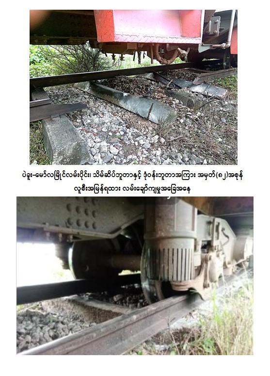 ယနေ့ မော်လမြိုင်မှ ထွက်ခွာလာသည့် အမှတ် (၈၂) အစုန် မော်လမြိုင်-ရန်ကုန်လူစီးအမြန်ရထားသည် မွန်ပြည်နယ်၊ သထုံမြို့နယ်၊ သိမ်ဆိပ်ဘူတာနှင့် ဒုံဝန်းဘူတာအကြား မိုင်တိုင်အမှတ်၊ ၁၂၃/၁၇-၁၅ သို့ နံနက် ၁၁ နာရီ ၁၀ မိနစ်အချိန် ရထားရောက်ရှိဖြတ်သန်းစဉ် အဆိုပါနေရာ၌ ရထားလမ်းမိုင်းပေါက်ကွဲထားခြင်းကြောင့် သံလမ်း (၁) ပေခွဲခန့် ပြတ်တောက်နေသဖြင့် စက်ခေါင်းနှင့်အတူ ရထားတွဲဆိုင်းတွင်ပါရှိသော လူစီးတွဲ (၂) တွဲ လမ်းချော်ကျမှုဖြစ်ပွားသည်။ ရထားလမ်းချော်ကျမှုကြောင့် ခရီးသည်နှင့် ဝန်ထမ်းထိခိုက်မှုမရှိဘဲ သိမ်ဆိပ်-ဒုံဝန်းလမ်းပိုင်းအား နံနက် ၁၁ နာရီ ၁၃ မိနစ်တွင် ယာယီပိတ်ထားခဲ့ရပါသည်။
