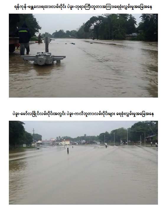 မြန်မာ့မီးရထားအနေဖြင့် ဇူလိုင်လ ၂၉ ရက် ယနေ့နံနက်ပိုင်းတွင် ရေတိုင်းထွာချက်များအရ ပဲခူးဘူတာယာဒ်ဝင်းအတွင်း၌ ရထားစင်္ကြံသံလမ်း၏ မျက်နှာပြင်အထက် ၁၀ လက်မခန့်အထိ ရေကျော်နေခြင်း၊ ရန်ကုန်-မန္တလေးရထားနှင့် ရန်ကုန်-မော်လမြိုင်ရထားတို့ ဖြတ်သန်းသည့် ပဲခူးနှင့် ဘုရားကြီး၊ ပဲခူးနှင့်ကလိဘူတာတို့အကြား ရထားလမ်းပိုင်းရှိ တံတားအမှတ် ၆၀ ပေါ်တွင် သံလမ်းမျက်နှာပြင်အထက် ၁၅ လက်မခန့် ရေကျော်နေခြင်းတို့ကြောင့် ရထားများ ဖြတ်သန်း နိုင်သည့်အခြေအနေ မရှိပါသဖြင့် လမ်းပိုင်းပိတ်ကာ ရန်ကုန်-မန္တလေးရထားခရီးစဉ်များ၊ ရန်ကုန်-မော်လမြိုင်ရထားခရီးစဉ်များကို ယာယီဖျက်သိမ်းထားကြောင်း သိရှိရသည်။