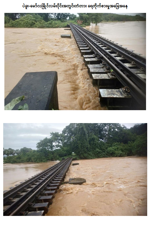 လက်ရှိမိုးရာသီကာအတွင်း ဇူလိုင်လ ၂၇ ရက်နေ့မှစ၍ ပဲခူးတိုင်းဒေသကြီး၊ ဧရာဝတီတိုင်းဒေသကြီးနှင့် မွန်ပြည်နယ်တို့အတွင်း၌ မိုးသည်းထန်စွာရွာသွန်းလျက်ရှိပြီး ရေကြီးရေလျှံမှုများကြောင့် မြန်မာ့မီးရထား၏ ရန်ကုန်-မန္တလေးလမ်းပိုင်းရှိ ပဲခူးဘူတာနှင့် ဘုရားကြီးဘူတာအကြားနှင့် ပဲခူး-မော်လမြိုင်လမ်းပိုင်းရှိ ပဲခူးဘူတာ-ကလိဘူတာအကြားတို့တွင်လည်းကောင်း၊ ဧရာဝတီတိုင်းဒေသကြီး၊ ပုသိမ်-ဟင်္သာတ-ကြံခင်းရထားလမ်းပိုင်းအတွင်း ကျောင်းကုန်းမြို့နယ်၊ ကန်ကြီးထောင့်မြို့နယ်နှင့် ရေကြည်မြို့နယ်တို့အတွင်း နေရာအချို့တွင်လည်းကောင်း ရထားသံလမ်းအပေါ်သို့ ရေကျော်တက်နေခြင်း၊ ရထားတံတားအချို့၏ ရေလည်တိုင်နှင့် ကမ်းကပ်ခုံများ ရေတိုက်စားခံရခြင်းတို့ ကြုံတွေ့ရလျက်ရှိသည်။