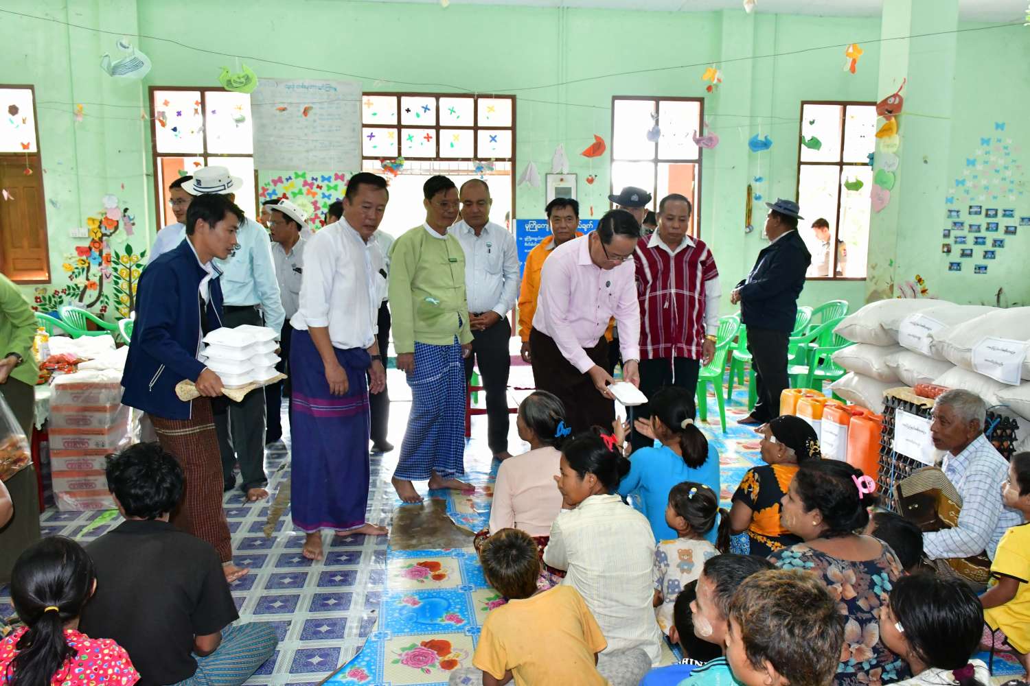 ထို့နောက် ပြည်နယ်ဝန်ကြီးချုပ်နှင့်အဖွဲ့သည် လှိုင်းဘွဲမြို့နယ်၊ ကမော့ကချူးကျေးရွာရှိ ဆိုင်ကလုန်းရှက်တာ (Cyclone Shelter) ရေဘေးကယ်ဆယ်ရေးစခန်းတွင် ယာယီပြောင်းရွှေ့နေထိုင်သော ရေဘေးသင့်ပြည်သူများအား သွားရောက်တွေ့ဆုံအားပေးစကားပြောကြားပြီး အဆိုပါကယ်ဆယ်ရေးစခန်းရှိ အိမ်ထောင်စု ၅၉ စု ၊ လူဦးရေ ၂၄၆ ဦး တို့အား ဆန်၊ ဆီ၊ ခေါက်ဆွဲခြောက်၊ ကြက်ဥအစရှိသော စားသောက်ကုန်ပစ္စည်းများ၊ လူမှုဝန်ထမ်း၊ကယ်ဆယ်ရေးနှင့် ပြန်လည်နေရာချထားရေးဝန်ကြီးဌာန၊ ဘေးအန္တရာယ်ဆိုင်ရာစီမံခန့်ခွဲမှုဦးစီးဌာနမှထောက်ပံ့သော ဆန်ရိက္ခာဖိုးငွေ ကျပ် ၅၁၆,၆၀၀(ကျပ် ငါးသိန်း တစ်သောင်း ခြောက်ထောင် ခြောက်ရာတိတိ) ကို ထောက်ပံ့ပေးအပ်ပြီး ရေဘေးသင့်ပြည်သူများ အသင့်စားသုံးနိုင်ရန်အတွက် နေ့လယ်စာထမင်းဘူးများကို တစ်ဦးချင်စီလိုက်လံဝေငှပေးခဲ့ကြသည်။
