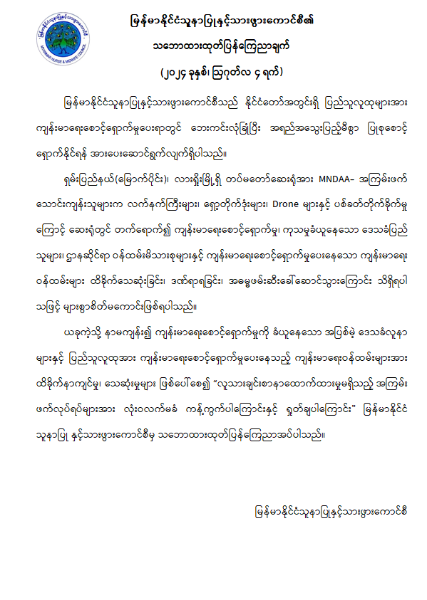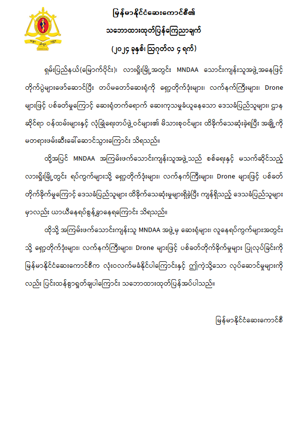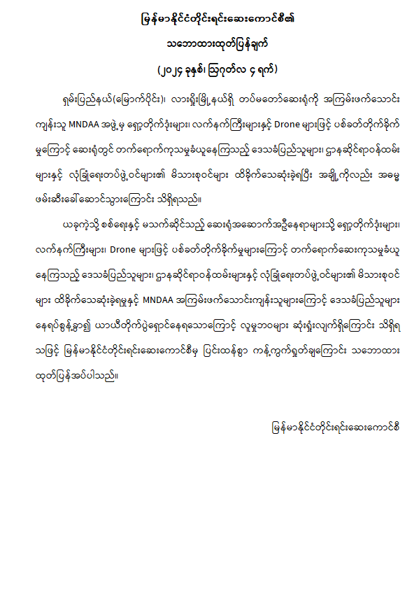 ယခုကဲ့သို့ MNDAA အကြမ်းဖက်သောင်းကျန်းသူအဖွဲ့၏ စစ်ရာဇဝတ်မှု (War Crime) မြောက်သည့် လူမဆန်စွာ ရက်စက်ယုတ်မာရိုင်းစိုင်းသော အကြမ်းဖက်လုပ်ရပ်များကို လုံးဝလက်မခံကြောင်းနှင့် ပြင်းထွန်စွာ ကန့်ကွက်ရှုတ်ချကြောင်းကို ယနေ့တွင် အသင်းအဖွဲ့များဖြစ်သည့် မြန်မာနိုင်ငံဆေးကောင်စီ၊ မြန်မာနိုင်ငံတိုင်းရင်းဆေးကောင်စီ၊ မြန်မာနိုင်ငံပုဂ္ဂလိကဆေးရုံများအသင်း၊ မြန်မာနိုင်ငံသူနာပြုနှင့်သားဖွားကောင်စီနှင့် မြန်မာနိုင်ငံသူနာပြုနှင့်သားဖွားအသင်းတို့က သဘောထားများ အသီးသီးထုတ်ပြန်ခဲ့ကြကြောင်း သတင်းရရှိသည်။