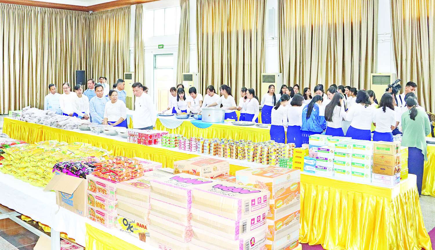 ပြည်ထောင်စုရာထူးဝန်အဖွဲ့ဝန်ထမ်းမိသားစုနှင့် နိုင်ငံ့ဝန်ထမ်းသင်တန်းသားများက ငွေကျပ်သိန်း ၁၁၀ တန်ဖိုးရှိ ငါးနီတူငါးပိကြော်ဘူး ၅၀၀၊ ငါးနီတူ ခြောက်ကြော်ဘူး ၂၀၀၊ ငါးခြောက်ထောင်းကြော်ဘူး ၁၂၅ ဘူး၊ ပဲပုပ်ကြော် ဘူး ၂၀၀၊ အာဗြဲခြောက်ကြော်ဘူး ၄၀၀၊ ပုစွန်ငါးပိကြော်ဘူး ၂၀၀၊ စုစုပေါင်း ၁၆၂၅ ဘူးနှင့် အခြားအသုံးအဆောင်များကို ပေးပို့သွားမည်ဖြစ်ကြောင်း သိရသည်။
