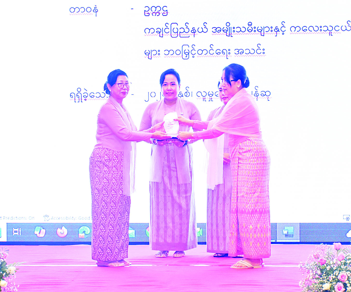 ယင်းနောက် မြန်မာနိုင်ငံ အမျိုးသမီးများနှင့် ကလေးသူငယ်များဘဝ မြှင့်တင်ရေးအသင်း၏ ဂုဏ်ထူးဆောင်နာယက ဒေါ်ကြူကြူလှက ပဲခူးတိုင်းဒေသကြီးမှ ဆောင်းပါးဆုများရရှိသူနှင့် ရှမ်းပြည်နယ်မှ လူမှုရေးထူးချွန်ဆုရရှိသူတို့ကို ဆုများပေးအပ်ချီးမြှင့်သည်။