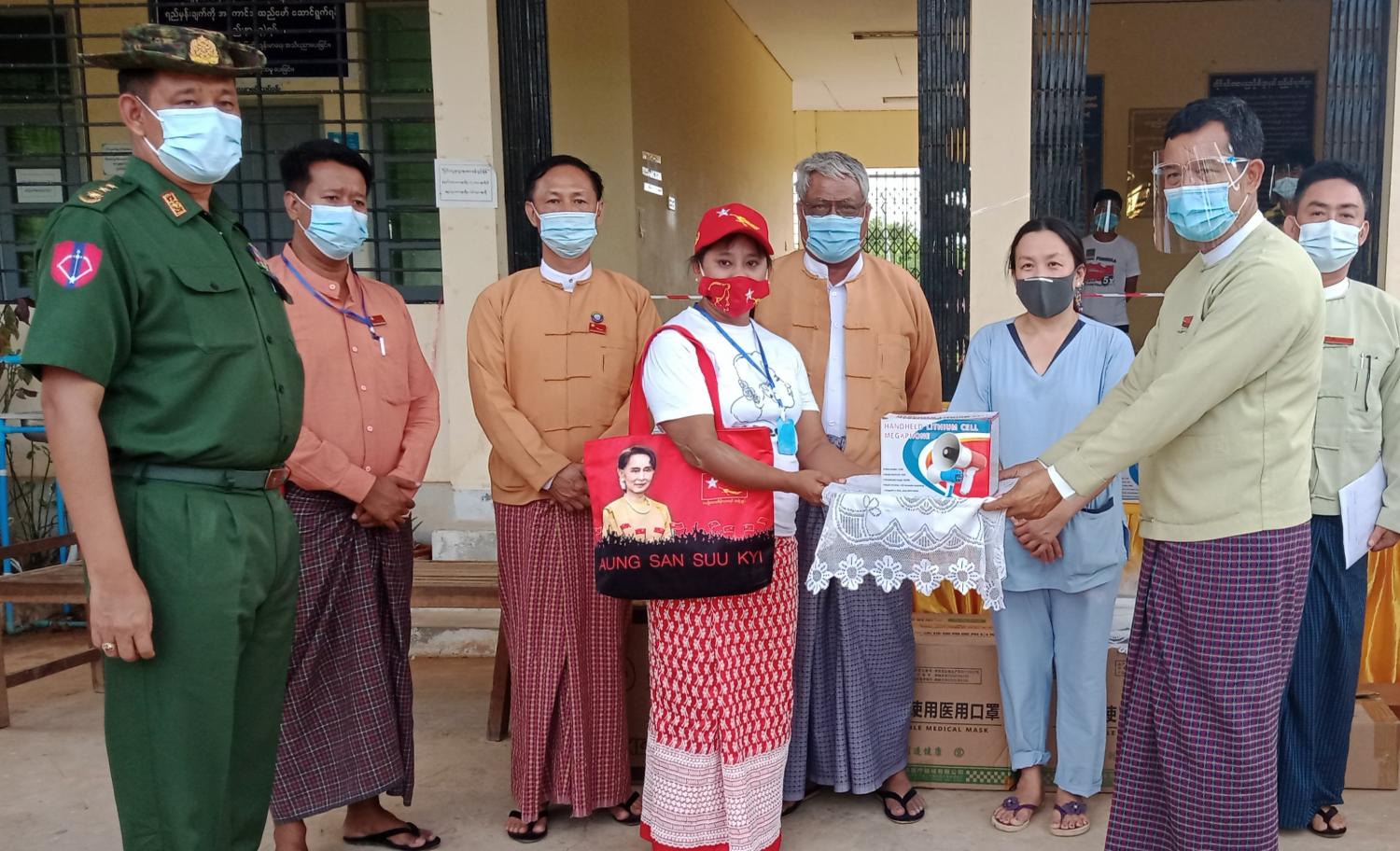 ထောက်ပံ့ပေးအပ်သော ပစ္စည်းများမှာ (PPE) ဝတ်စုံ (၅) စုံ၊ (mask)၂၈၀ ဗူး၊ Face Shield (၅၀) ခု၊ Hand Speaker (၅၀)၊ လက်အိတ်(၁၀)ဗူးနှင့် လက်သန့်ဆေးရည်(၁၀)ဗူးတို့ ဖြစ်ကြောင်း သိရှိရသည်။
