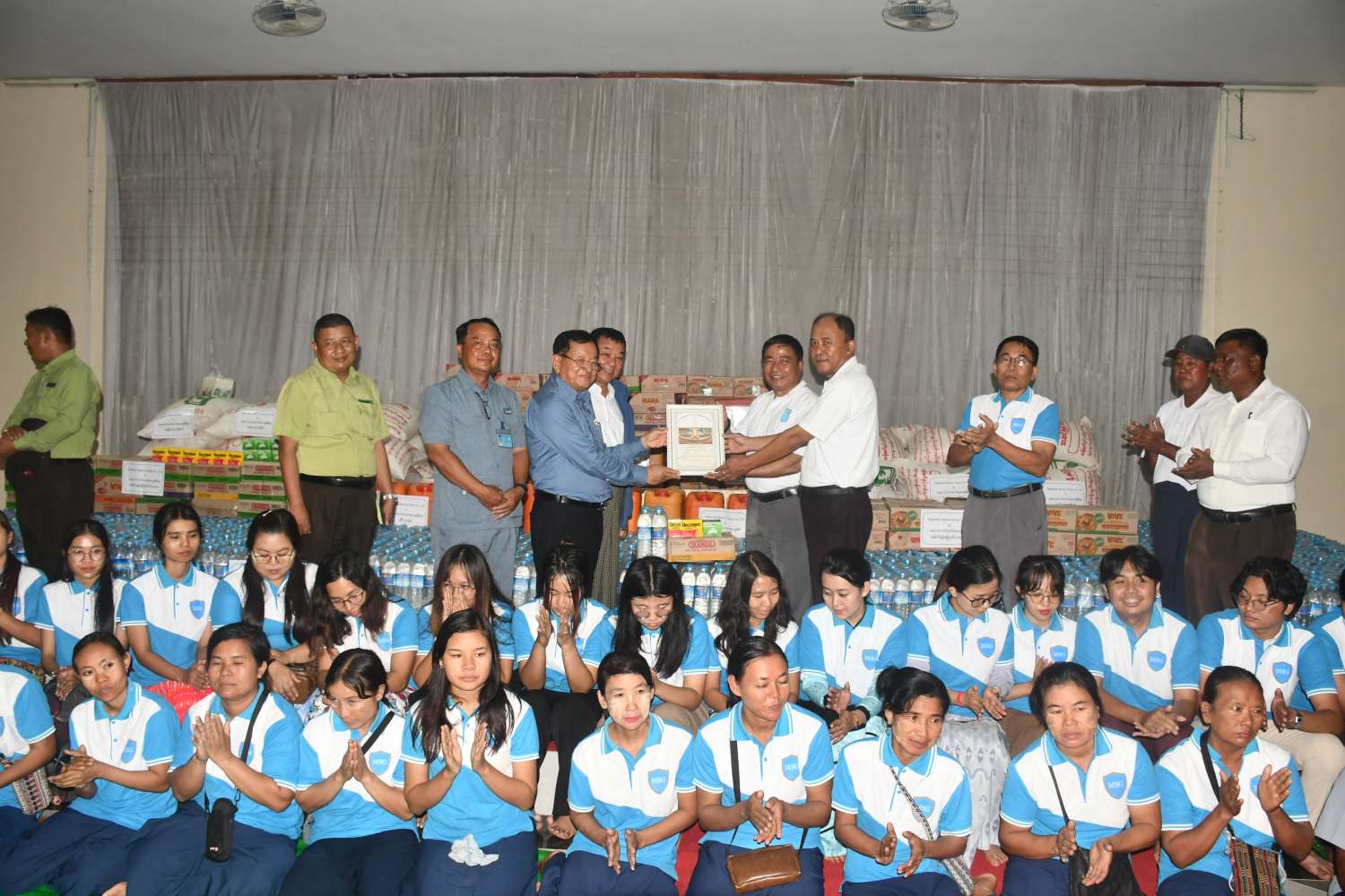 ရှေးဦးစွာ နေပြည်တော်ကောင်စီဝင် ဦးမြင့်စိုးက ရေဘေးတိမ်းရှောင်သူများအနေဖြင့် သဘာဝဘေးဖြစ်ပွားမှုကို ကြံ့ကြံ့ခံရင်ဆိုင်ကျော်လွှားကြရန်လိုကြောင်း၊ နေပြည်တော်ကောင်စီအနေဖြင့် ကူညီကယ်ဆယ်ရေးလုပ်ငန်းများနှင့် ရေဘေးရှောင်ပြည်သူများ၏ နေထိုင်စားသောက်ရေး၊ ကျန်းမာရေးဆိုင်ရာကိစ္စရပ်များကို စီစဉ်ဆောင်ရွက်လျက်ရှိကြောင်း ပြောကြားသည်။