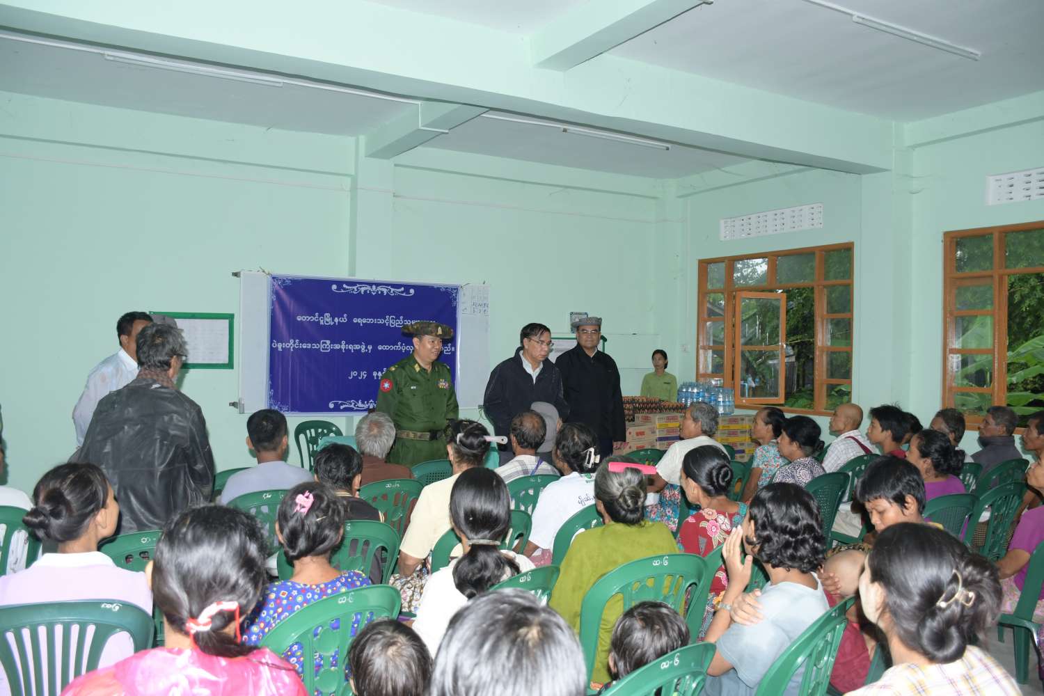 ရှေးဦးစွာ ပဲခူးတိုင်းဒေသကြီးအစိုးရအဖွဲ့ဝန်ကြီးချုပ် ဦးမျိုးဆွေဝင်း၊ တောင်ပိုင်းတိုင်း စစ်ဌာနချုပ်တိုင်းမှူး ဗိုလ်ချုပ် ကြည်သိုက်နှင့် တိုင်းဒေသကြီး အစိုးရအဖွဲ့ဝင်များသည် တောင်ငူခရိုင်သဘာဝဘေးအန္တရာယ်ဆိုင်ရာ စီမံကွပ်ကဲမှုအဖွဲ့ရုံးဖွင့်လှစ်ထားသည့် သာသနာ့ ဗိမာန်တော်ကြီး၌ ခရိုင်ဘေးအန္တရာယ်ဆိုင်ရာ စီမံခန့်ခွဲမှုအဖွဲ့ဝင်များနှင့်တွေ့ဆုံ၍ ရေဘေးသင့် ပြည်သူများအား ကယ်ဆယ်ရေးလုပ်ငန်းဆောင်ရွက်နေမှု၊ ရေဘေးရှောင်စခန်းများ စီမံ ဆောင်ရွက်ထားမှုနှင့် ရေဘေးသင့်ပြည်သူများအတွင် ဆန်၊ဆီ၊ ကြက်ဥနှင့် စားသောက်ဖွယ်ရာများ စီစဥ်ဆောင်ရွက်နေမှုများကို လမ်းညွှန်ဆွေးနွေးပြောကြားပြီး လိုအပ်သည်များဆောင်ရွက်ပေးသည်။