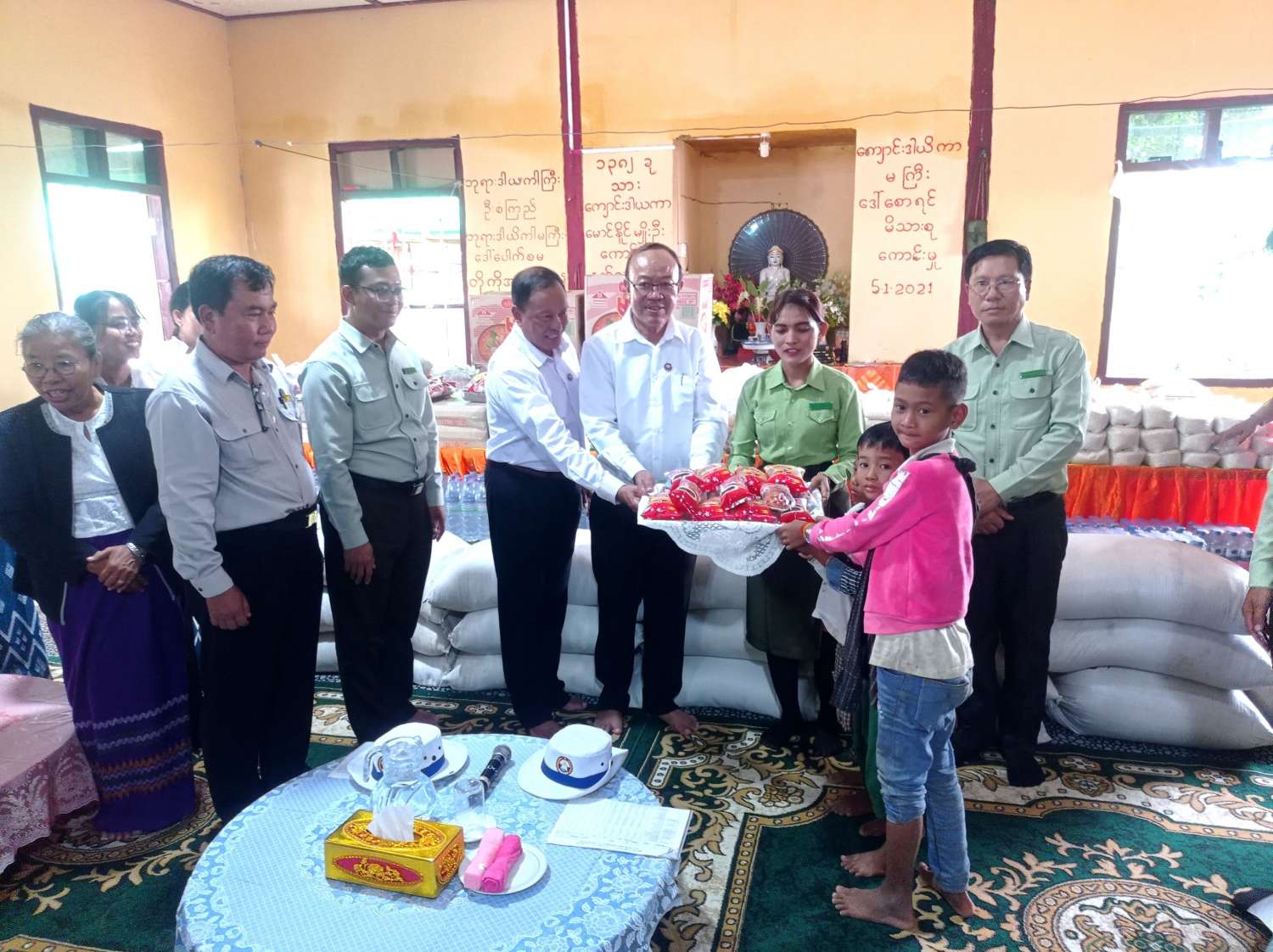 ရှေးဦးစွာ တိုင်းဒေသကြီးအစိုးရအဖွဲ့ဝင် သယံဇာတရေးရာဝန်ကြီး ဦးရွှေဇင်နှင့် လမ်းပန်း ဆက်သွယ်ရေး ဝန်ကြီးဦးအောင်ဇော်ဦးတို့က ကျောင်းထိုင်ဆရာတော်ထံ လှူဖွယ်ပစ္စည်းများနှင့် ဆေးခြင်းများ ဆပ်ကပ်လှူဒါန်းသည်။ ထို့နောက် ထောက်ပံ့ပေးအပ်ပွဲ အခမ်းအနားပြုလုပ်ရာ ဝန်ကြီးများက ရေဘေးသင့်ပြည်သူ ၇၁၆ ဦးအတွက် တိုင်းဒေသကြီးအစိုးရအဖွဲ့မှ ထောက်ပံ့ ပေးအပ်သည့် သုံရက်စာ ဆန် ၂၄ ပြည်အိတ် ၂၃ အိတ်၊ ရေသန့်တစ်လီတာဘူး ၅၀၀ ဘူး၊ ခေါက်ဆွဲခြောက်နှင့် မုန့်များထောက်ပံ့ပေးအပ်သည်။