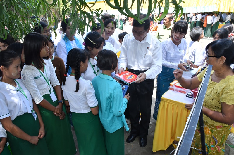 ၎င်းနောက် တိုင်းဒေသကြီးဝန်ကြီးချုပ်နှင့်အဖွဲ့သည် ကျောင်းခန်းမအသီးသီးရှိ ကလေးစာဖတ်ခန်း၊ စာဖတ်စွမ်းရည်ပြိုင်ပွဲ၊ ဆေးရောင်ခြယ်ပြိုင်ပွဲ၊ ကာတွန်းပြိုင်ပွဲ၊ ကလေးပန်းချီပြိုင်ပွဲ၊ ပုံပြင်ပြောပြိုင်ပွဲ၊ ကျပန်းစကားပြောပြိုင်ပွဲ၊ စက္ကူခေါက်ပြိုင်ပွဲ၊ စကားပုံဆက်နှင့် အရုပ်ဆက် ပြိုင်ပွဲ၊ မြှားပစ်ပြိုင်ပွဲ၊ ဂိုးကျဉ်းသွင်း၊ ဗူပေါင်းဖေါက်၊ဘောလုံးဖေါက်ပြိုင်ပွဲများ၊ အာလူးကောက်၊ ဂုံနီအိတ်စွတ်အပြေးပြိုင်ပွဲ၊ ဗန်းရွက်ပြိုင်ပွဲ၊ ခါးကွင်းလှည့်၊ စက်ဝိုင်းလှည့်ပြိုင်ပွဲများ၊ ခင်းကျင်းပြသထားသည့် စာအုပ်စာစောင်များနှင့် ဆင်ရုပ်ချိုးအနာပညာပြခန်း၊ ခရိုင်အသေးစား စက်မှုလက်မှုဦးစီးဌာနပြခန်း၊ နည်းပညာ၊ သက်မွေးပညာနှင့်လေ့ကျင့်ရေးဆရာ အတတ်သင်ကာ လိပ်ပြခန်း၊ အစိုးရစက်မှုလက်မှုသိပ္ပံနှင့်အစိုးရနည်းပညာ အထက်တန်းကျောင်းပြခန်း၊ မေတ္တာကိုယ်ပိုင်အထက်တန်းကျောင်းပြခန်း၊ ကိုယ်ပိုင်မူလတန်းကျောင်းများပြခန်း၊ ဇီဝနည်းပညာသုတေသနဦးစီးဌာနပြခန်း၊ ခရိုင်ပတ်ဝန်းကျင်ထိန်းသိမ်းရေးဦးစီးဌာနနှင့် ခရိုင်သစ်တောဦးစီးဌာနပြခန်းများအား လှည့်လည်ကြည့်ရှုအားပေးကြကြောင်း သိရသည်။