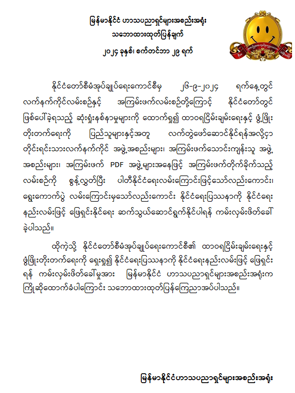 နိုင်ငံတော်စီမံအုပ်ချုပ်ရေးကောင်စီအနေဖြင့် လက်နက်ကိုင်လမ်းစဉ်နှင့် အကြမ်းဖက်လမ်းစဉ်တို့ကြောင့် နိုင်ငံတော်တွင်ဖြစ်ပေါ်ခဲ့ရသည့် ဆုံးရှုံးနစ်နာမှုမျာကိုထောက်ရှု၍ ထာဝရငြိမ်းချမ်းရေးနှင့် ဖွံ့ဖြိုးတိုးတက်ရေးကို ပြည်သူများနှင့်အတူ လက်တွဲဖော်ဆောင်နိုင်ရန်အလို့ငှာ နိုင်ငံတော်အားဆန့်ကျင်တိုက်ခိုက်နေသည့် တိုင်ရင်းသားလက်နက်ကိုင်အဖွဲ့အစည်းများ၊ အကြမ်းဖက်သောင်းကျန်သူအဖွဲ့အစည်းများ၊ အကြမ်းဖက် PDF အဖွဲ့များအား လက်နက်ကိုင်အကြမ်းဖက်တိုက်ခိုက်သည့် လမ်းစဉ်ကို စွန့်လွှတ်ကာ ပါတီနိုင်ငံရေးလမ်းကြောင်းဖြင့်သော်လည်းကောင်း၊ ရွေးကောက်ပွဲလမ်းကြောင်းမှသော်လည်းကောင်း နိုင်ငံရေးပြဿနာကို နိုင်ငံရေးနည်းလမ်းဖြင့် ဖြေရှင်းနိုင်ရေး ဆက်သွယ်ဆောင်ရွက်နိုင်ပါရန် ၂၀၂၄ ခုနှစ်၊ စက်တင်ဘာလ ၂၆ ရက်နေ့တွင် ကမ်းလှမ်းဖိတ်ခေါ်ခဲ့ပါသည်။