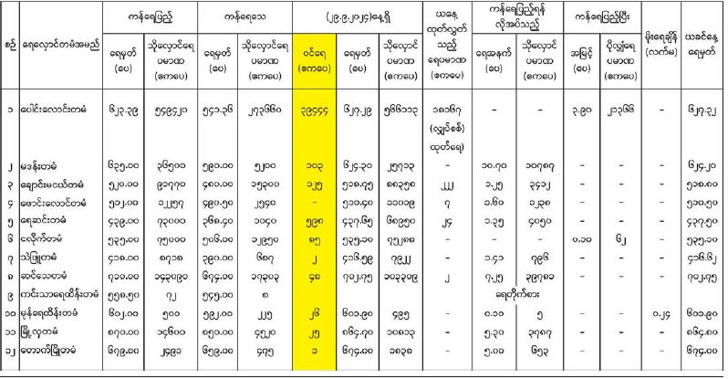 အလားတူ ဆည်မြောင်းနှင့် ရေအသုံးချမှုစီမံခန့်ခွဲရေးဦးစီးဌာနက ထိန်းသိမ်းထားသော ရေလှောင်တမံ (၂၄၆) ခုအနက်မှ စက်တင်ဘာ ၂၉ ရက်တွင် ကန်ရေပြည့် အမှတ်အထက်ကျော်လွန်၍ ရေပိုလွှဲမှရေကျော် စီးဆင်းနေသည့် ရေလှောင်တမံများမှာ ကရင်ပြည်နယ်တွင် (၁)ခု၊ ချင်းပြည်နယ်တွင် (၃)ခု၊ စစ်ကိုင်းတိုင်းဒေသကြီးတွင်(၂)ခု၊ ပဲခူးတိုင်းဒေသကြီးတွင် (၁၁) ခု၊ မကွေးတိုင်းဒေသကြီးတွင် (၁၁) ခု၊ မန္တလေးတိုင်းဒေသကြီးတွင် (၄) ခု၊ နေပြည်တော်တွင် (၂)ခု၊ မွန်ပြည်နယ်တွင် (၂)ခု၊ ရခိုင်ပြည်နယ်တွင် (၁)ခု၊ ရန်ကုန်တိုင်းဒေသကြီးတွင် (၃) ခု၊ ရှမ်းပြည်နယ် (တောင်ပိုင်း) တွင် (၂) ခု၊ ရှမ်းပြည်နယ်(မြောက်ပိုင်း) တွင် (၁)ခုနှင့် ဧရာဝတီတိုင်းဒေသကြီးတွင် (၄) ခုဖြစ်ပြီး စုစုပေါင်း (၄၇) ခုရှိပြီး ယခင်နေ့ ရေကျော်ခဲ့သည့် ရေလှောင်တမံ (၅၀)ခုထက် (၃) ခု လျော့နည်းခြင်းဖြစ်သည်။