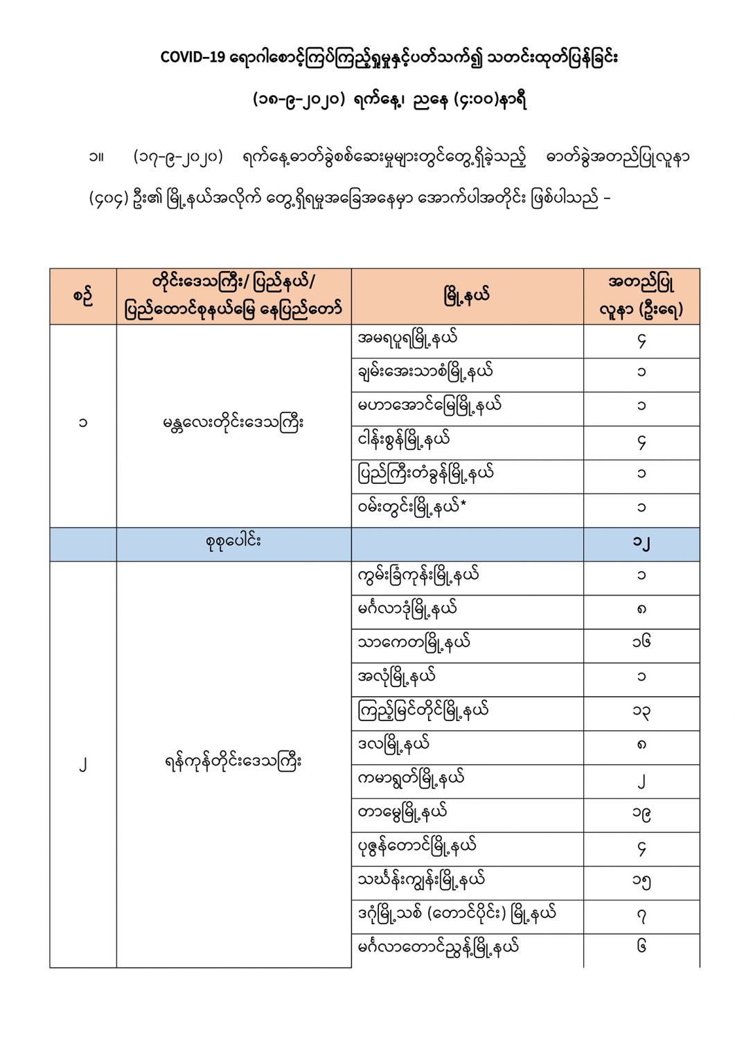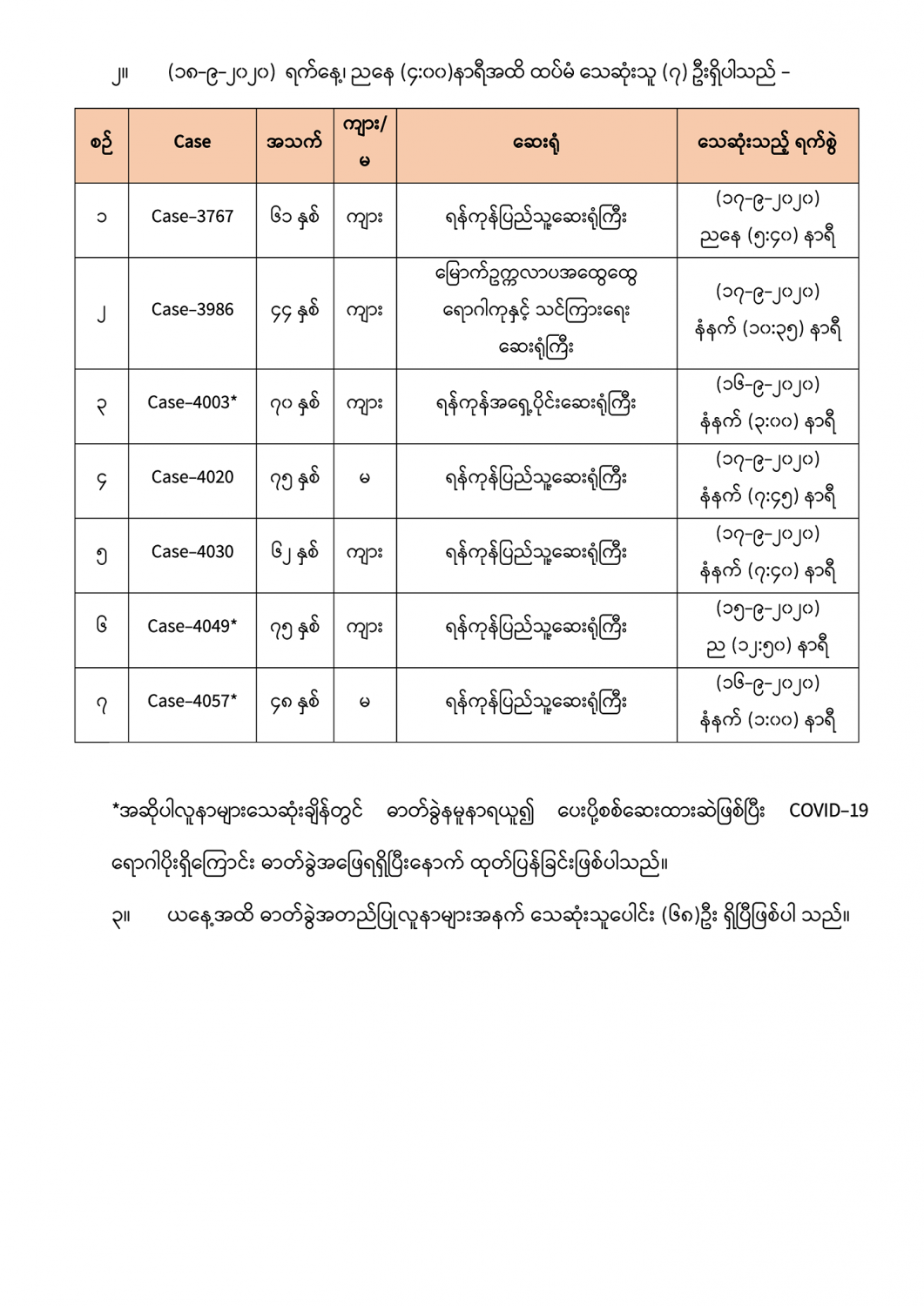 COVID-19 ရောဂါစောင့်ကြပ်ကြည့်ရှုမှုနှင့်ပတ်သက်၍ သတင်းထုတ်ပြန်ခြင်း (၁၈-၉-၂၀၂၀) ရက်နေ့၊ ညနေ (၄:၀၀) နာရီ 09/18/2020 ၁။ ယမန်နေ့ (၁၇-၉-၂၀၂၀) ရက်နေ့ COVID-19 ရောဂါ ဓာတ်ခွဲစစ်ဆေးရာတွင် တွေ့ရှိခဲ့ရသည့် COVID-19 လူနာများတွေ့ရှိမှုအခြေအနေများကို ဖော်ပြအပ်ပါသည်။