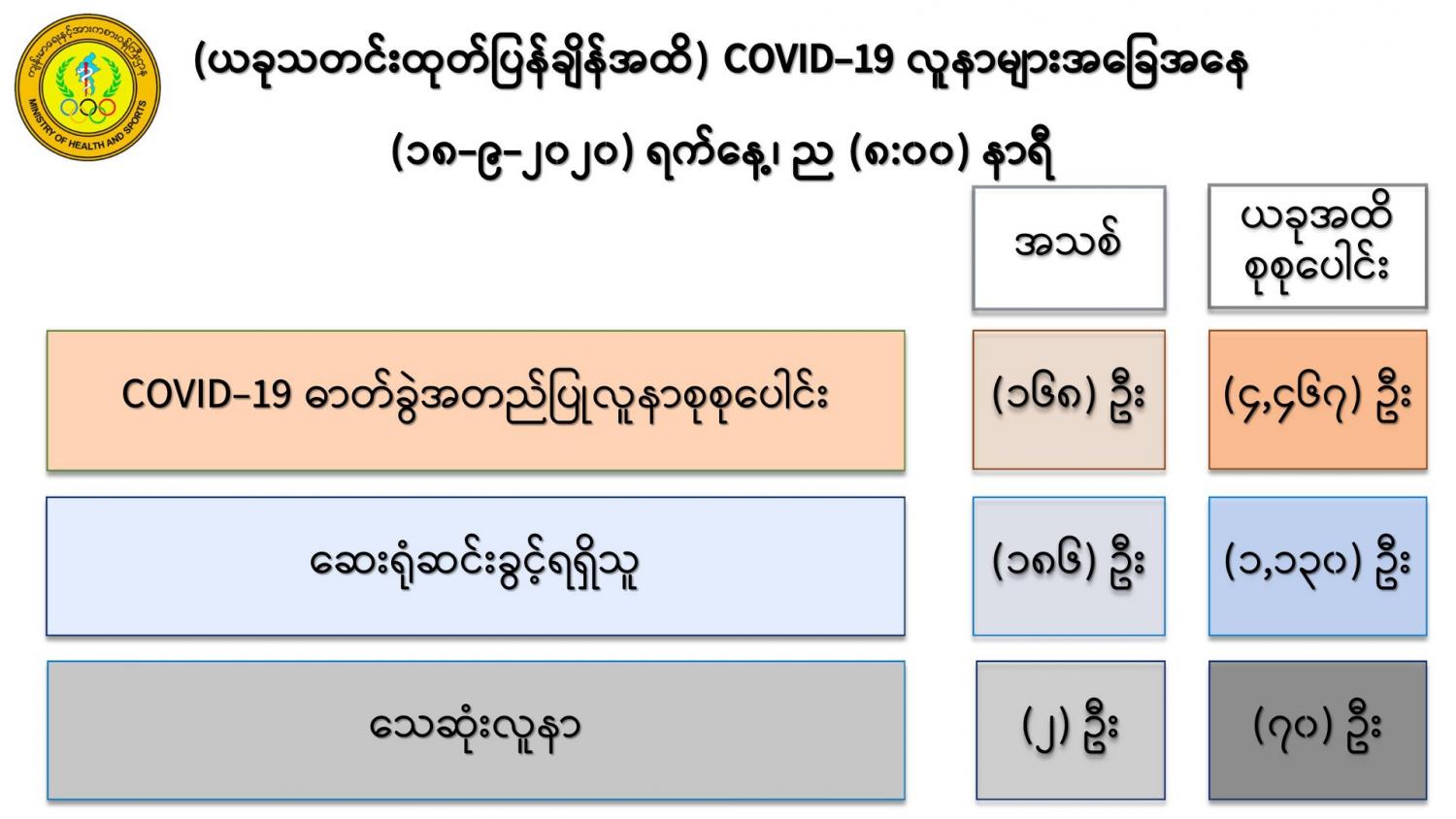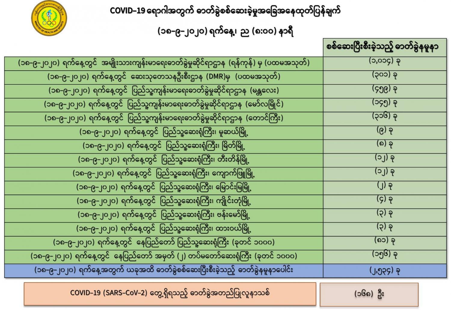 ၁။ (၁၈-၉-၂၀၂၀) ရက်နေ့၊ နံနက် (၈:၀၀) နာရီမှ ည (၈:၀၀) နာရီအတွင်း COVID-19 ဓာတ်ခွဲ စစ်ဆေးချက်များအရ -