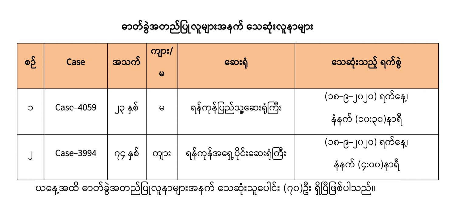 ၄။ (၁၈-၉-၂၀၂၀) ရက်နေ့၊ ည (၈:၀၀)နာရီအထိ ထပ်မံသေဆုံးသူ (၂) ဦး ရှိပါသည်။