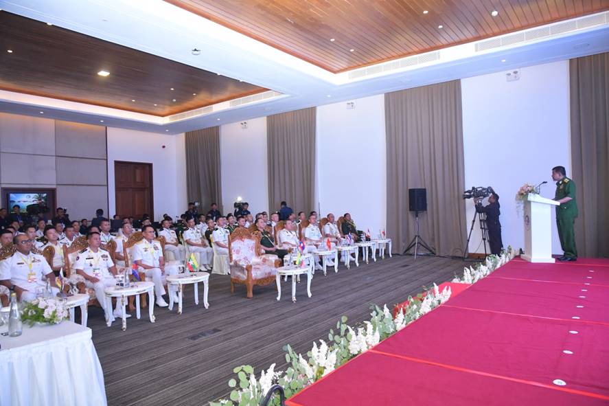 မြန်မာနိုင်ငံမှ ဒုတိယအကြိမ် အိမ်ရှင်အဖြစ် လက်ခံကျင်းပသည့် (၁၈) ကြိမ်မြောက် အာဆီယံရေတပ်ဦးစီးချုပ်များအစည်းအဝေး (18th ASEAN Navy Chief's Meeting) ဖွင့်ပွဲအခမ်းအနားကို ယနေ့နံနက်ပိုင်းတွင် နေပြည်တော်ရှိ M Gallery Hotel ၌ ပြုလုပ်ရာ နိုင်ငံတော်စီမံအုပ်ချုပ်ရေးကောင်စီအဖွဲ့ဝင် ညှိနှိုင်းကွပ်ကဲရေးမှူး (ကြည်း၊ ရေ၊ လေ) ဗိုလ်ချုပ်ကြီး မောင်မောင်အေး တက်ရောက်အမှာစကားပြောကြားသည်။