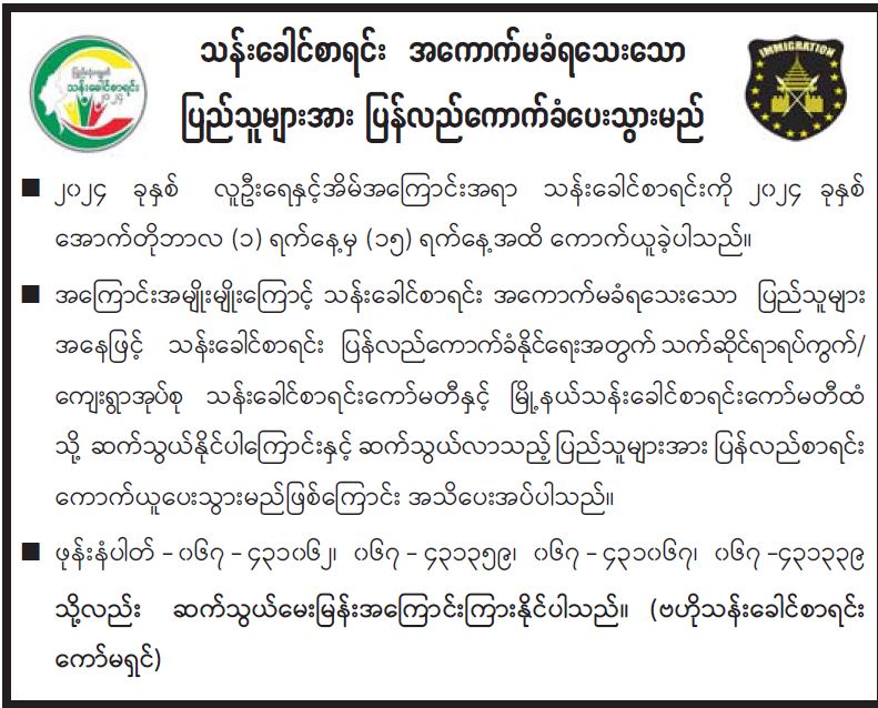 သန်းခေါင်စာရင်း အကောက်မခံရသေးသော ပြည်သူများအား ပြန်လည်ကောက်ခံပေးသွားမည်