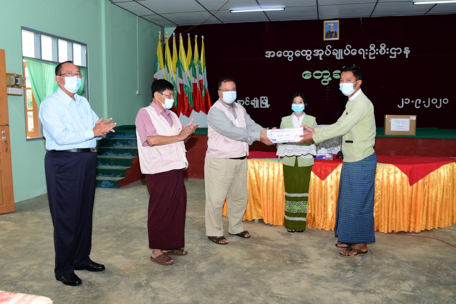 ဆက်လက်၍ ရှမ်းပြည်နယ် အစိုးရအဖွဲ့ပြည်နယ်ဝန်ကြီးချုပ် ဒေါက်တာလင်းထွဋ်၊ ဗမာတိုင်းရင်းသား လူမျိုးရေးရာဝန်ကြီး ဒေါက်တာ အောင်သန်းမောင်၊ ပြည်နယ်အစိုးရ အဖွဲ့အတွင်းရေးမှူး ဦးနေလင်းတို့မှ မြို့နယ် ကိုဗစ်-၁၉ ထိန်းချုပ်ရေးနှင့် အရေးပေါ် တုံ့ပြန်ရေး ကော်မတီ ထံသို့ ထောက်ပံ့ငွေ ကျပ်(၁၀) သိန်းနှင့် ကျန်းမာရေးသုံးပစ္စည်းများ ဖြစ်သည့် mask(၂၅၀၀)ခု တို့ကို ပေးအပ်ရာမြို့နယ် ကိုဗစ်-၁၉ ထိန်းချုပ် ရေးနှင့် အရေးပေါ် တုံ့ပြန်ရေးကော်မတီဥက္ကဋ္ဌ၊ နောင်ချိုမြို့နယ်အထွေထွေ အုပ်ချုပ်ရေးမှူး ဦးသွင်ကိုကိုမင်း က လက်ခံရယူပြီး ရှမ်းပြည်နယ် အစိုးရအဖွဲ့ ပြည်နယ်ဝန်ကြီးချုပ် ဒေါက်တာ လင်းထွဋ် က နိဂုံးချုပ် အမှာစကား ပြောကြားရာ ကိုဗစ်-၁၉ ရောဂါသည် ကမ္ဘာနဲ့အဝန်း ဖြစ်ပွားနေသည့်ကို အားလုံး အသိဖြစ်ပါကြောင်း၊ ကိုဗစ်-၁၉ ရောဂါထိန်းချုပ်မှု နှင့်ပတ်သက်၍ မြို့နယ် ကိုဗစ်-၁၉ ထိန်းချုပ်ရေးနှင့် အရေးပေါ် တုံ့ပြန်ရေးကော်မတီဥက္ကဋ္ဌမှ ရှင်းပြသည့်အတွက် ကျေးဇူးတင်ရှိပါ ကြောင်း၊ နောင်ချိုမြို့နယ်အတွင်း ကိုဗစ်-၁၉ ရောဂါကာကွယ် ရေးအတွက် အားလုံးက ဝိုင်းဝန်း ထိန်းသိမ်းပေးသည့်အတွက် ကျေးဇူးတင်ရှိကြောင်းနှင့် ကျန်းမာရေးကိုလည်း အထူးဂရုစိုက် ဆောင်ရွက် ကြရန်ပြောကြားသွားကြောင်း သိရသည်။