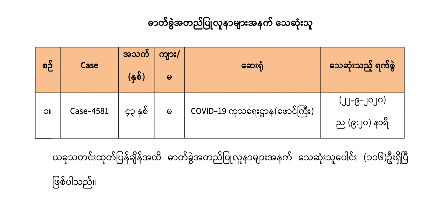 ၄။ (၂၃-၉-၂၀၂၀) ရက်နေ့၊ နံနက် (၈:၀၀) နာရီအထိ ထပ်မံသေဆုံးသူ (၁) ဦး ရှိပါသည်။