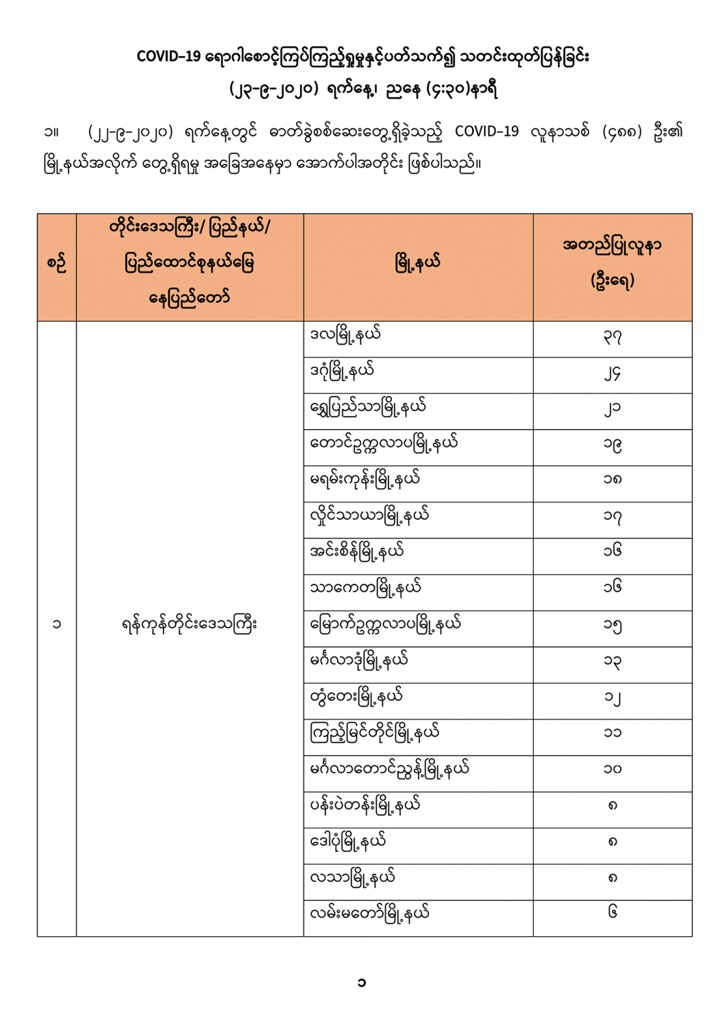 ၁။ (၂၂-၉-၂၀၂၀) ရက်နေ့တွင် ဓာတ်ခွဲစစ်ဆေးတွေ့ရှိခဲ့သည့် COVID-19 လူနာသစ် (၄၈၈) ဦး၏ မြို့နယ်အလိုက် တွေ့ရှိရမှု အခြေအနေမှာ အောက်ပါအတိုင်း ဖြစ်ပါသည်။