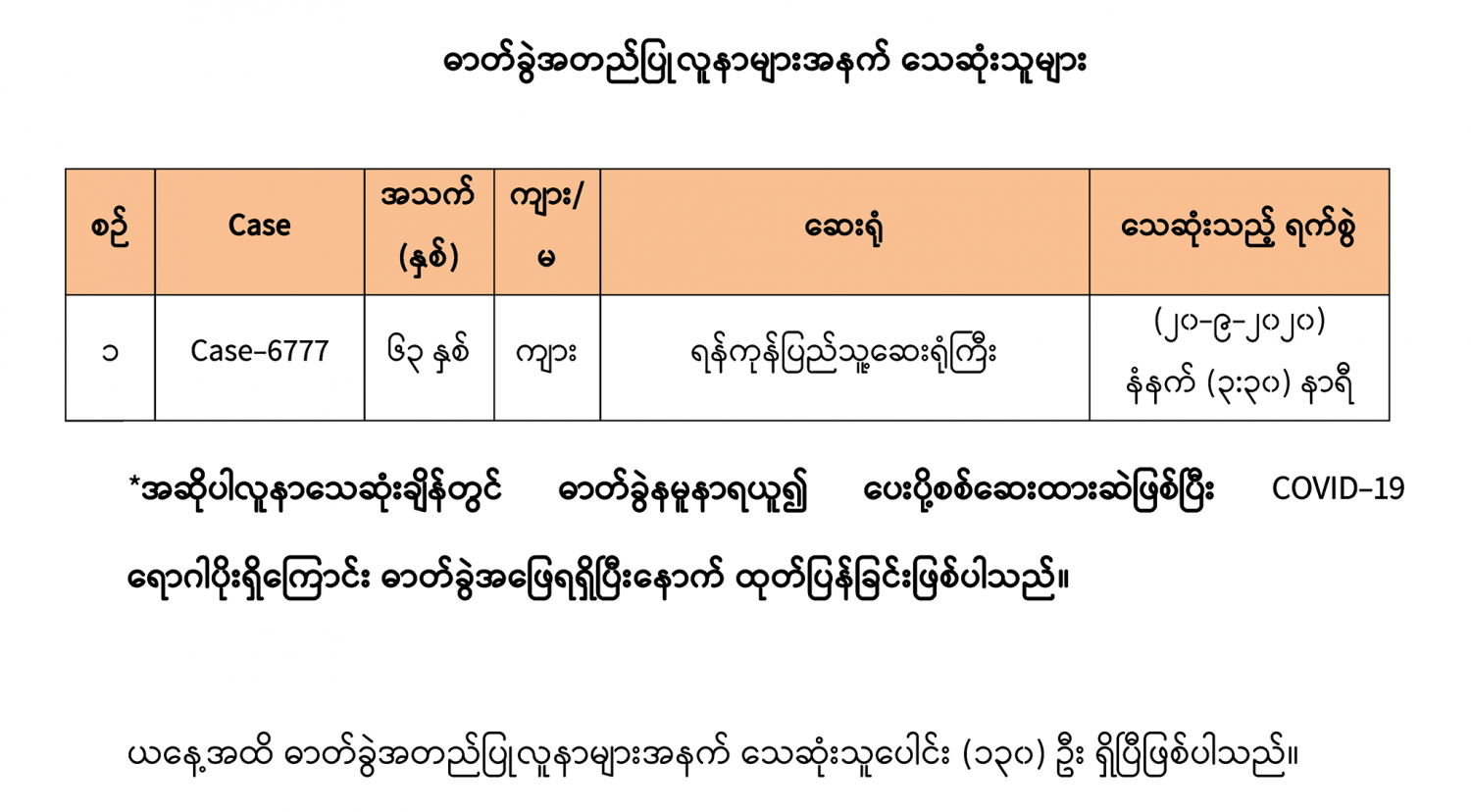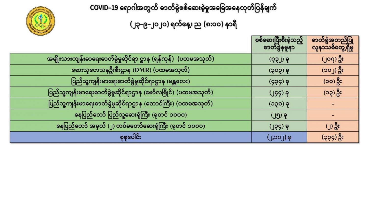 ၁။ (၂၃-၉-၂၀၂၀) ရက်နေ့၊ နံနက် (၈:၀၀)နာရီမှ ည (၈:၀၀)နာရီအတွင်း COVID-19 ဓာတ်ခွဲ စစ်ဆေးချက်များအရ -