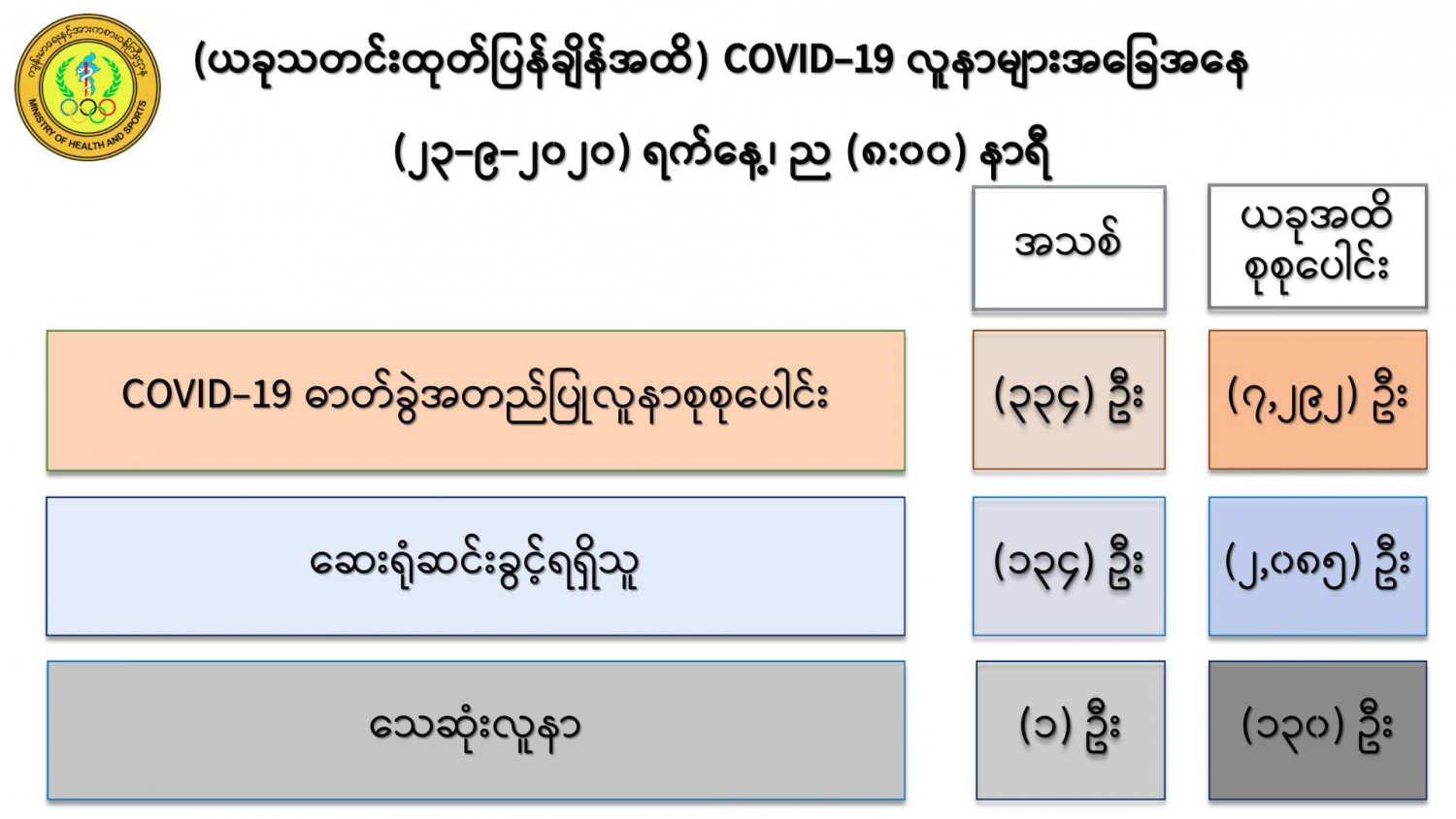 ၂။ (၂၃-၉-၂၀၂၀) ရက်နေ့၊ ည (၈:၀၀)နာရီအထိ မြန်မာနိုင်ငံတွင် COVID-19 ရောဂါဓာတ်ခွဲ အတည်ပြုလူနာ (၇,၂၉၂) ဦးရှိပြီ ဖြစ်ပါသည်။
