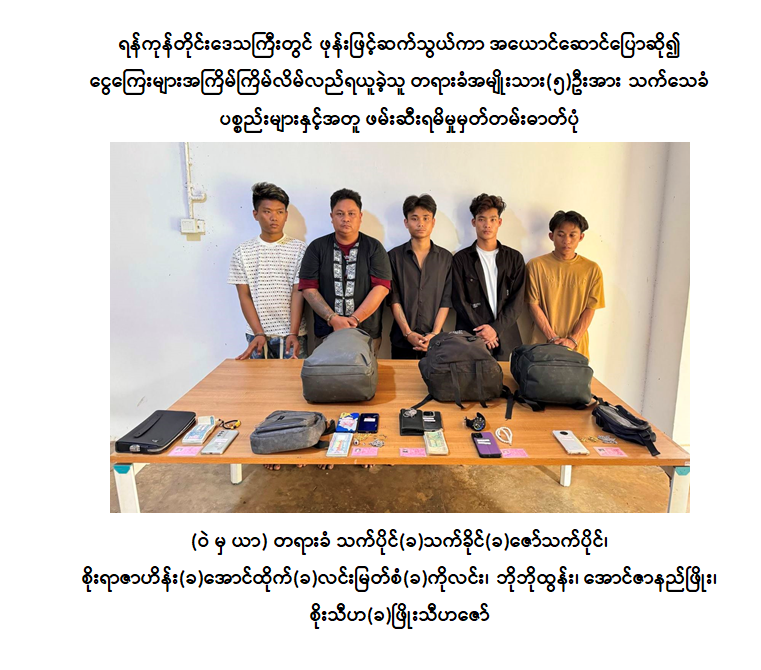ရန်ကုန်တိုင်းဒေသကြီးတွင် ဖုန်းဖြင့်ဆက်သွယ်ကာ အယောင်ဆောင်ပြောဆို၍ ငွေကြေးများ အကြိမ်ကြိမ်လိမ်လည်ရယူခဲ့သူ တရားခံအမျိုးသား (၅) ဦးအား သက်သေခံပစ္စည်းများနှင့်အတူ ၂၀၂၄ ခုနှစ်၊ နိုဝင်ဘာလ ၁၇ ရက်နေ့က ဖမ်းဆီးရမိခဲ့ကြောင်း သိရသည်။