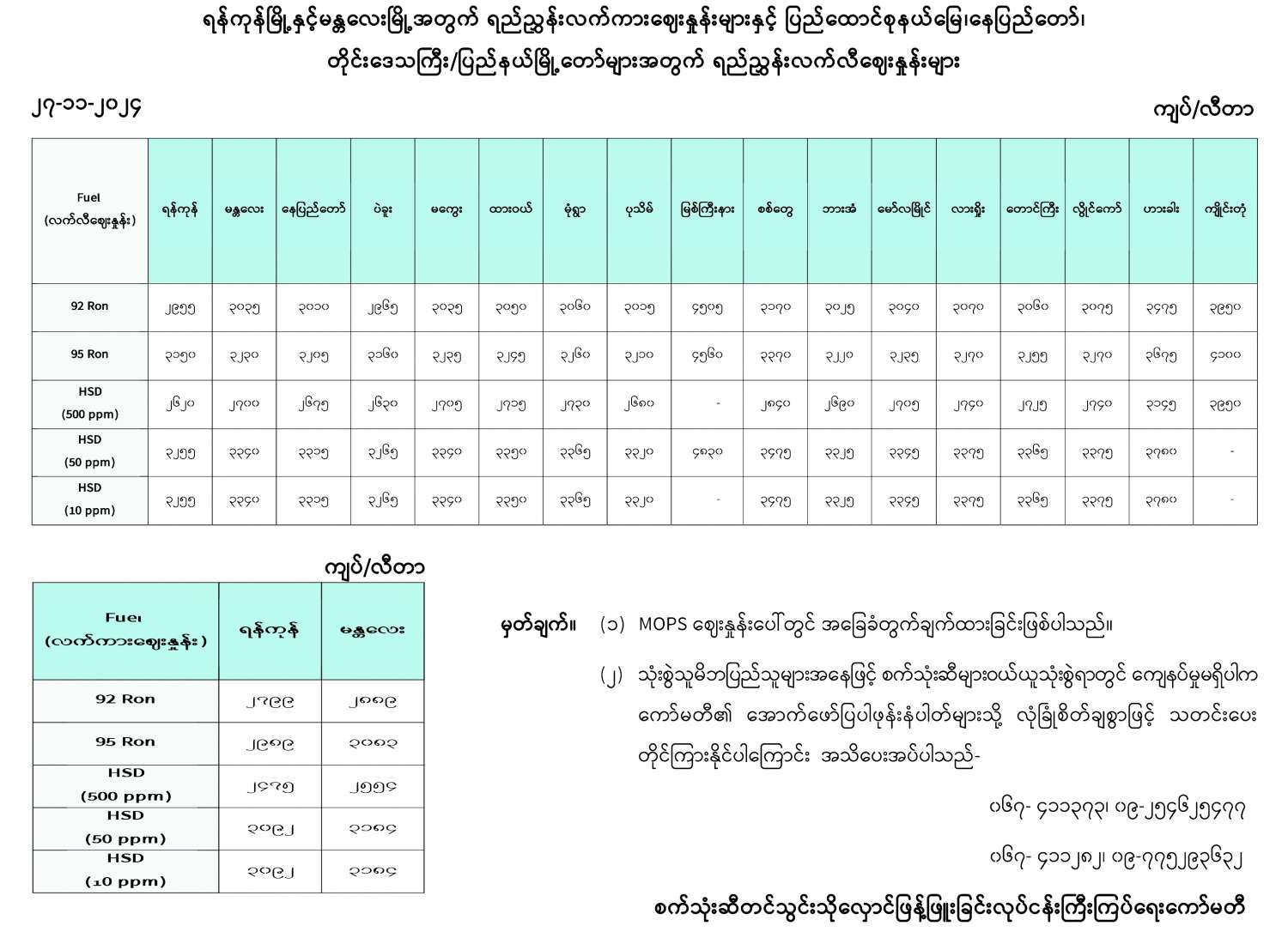 ရန်ကုန်မြို့နှင့် မန္တလေးမြို့အတွက် ရည်ညွှန်းလက်ကားဈေးနှုန်းများနှင့် ပြည်ထောင်စုနယ်မြေ နေပြည်တော်၊ တိုင်းဒေသကြီး/ပြည်နယ် မြို့တော်များအတွက် ရည်ညွှန်းလက်လီဈေးနှုန်းများ 11/27/2024